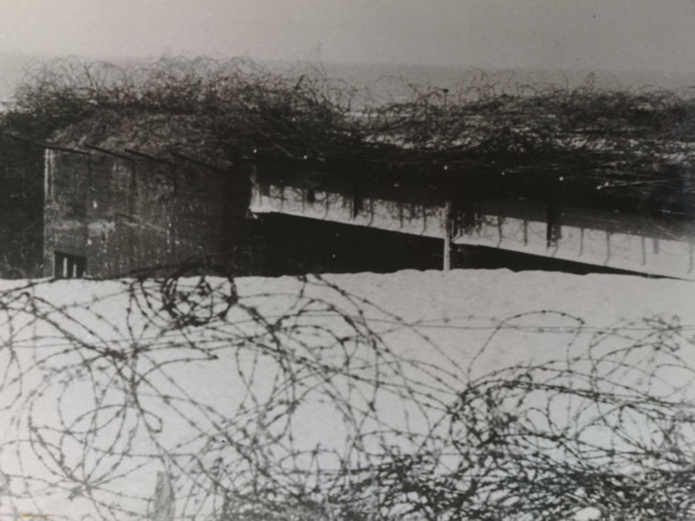 Bunker met prikkeldraad met zee op achtergrond. Teks...