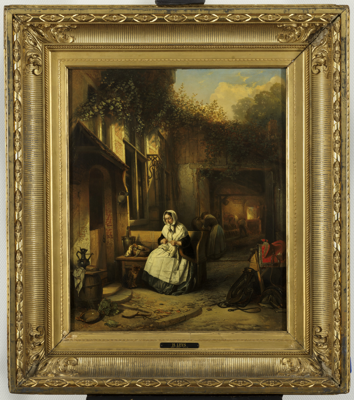 Breiende vrouw op binnenplaats