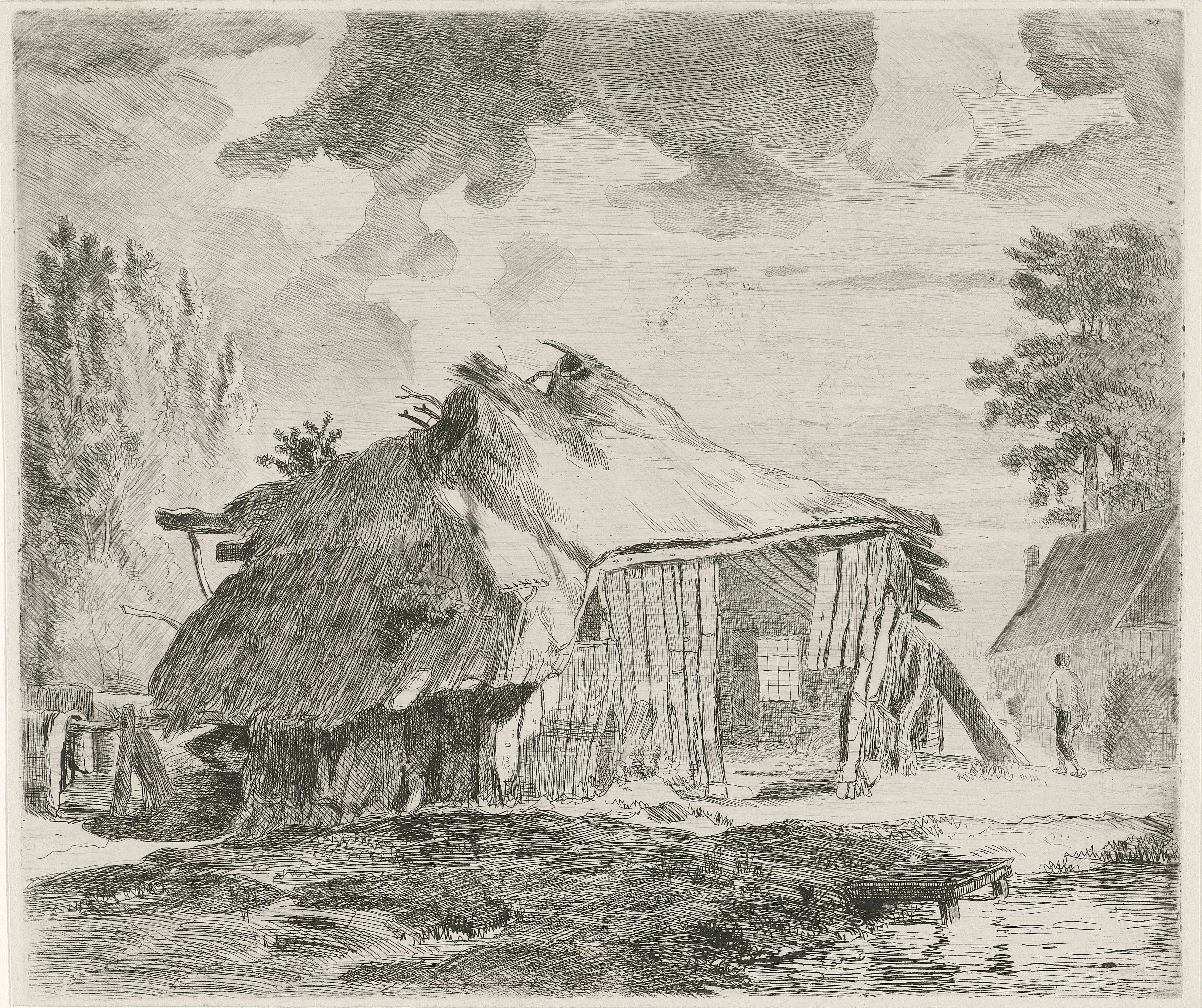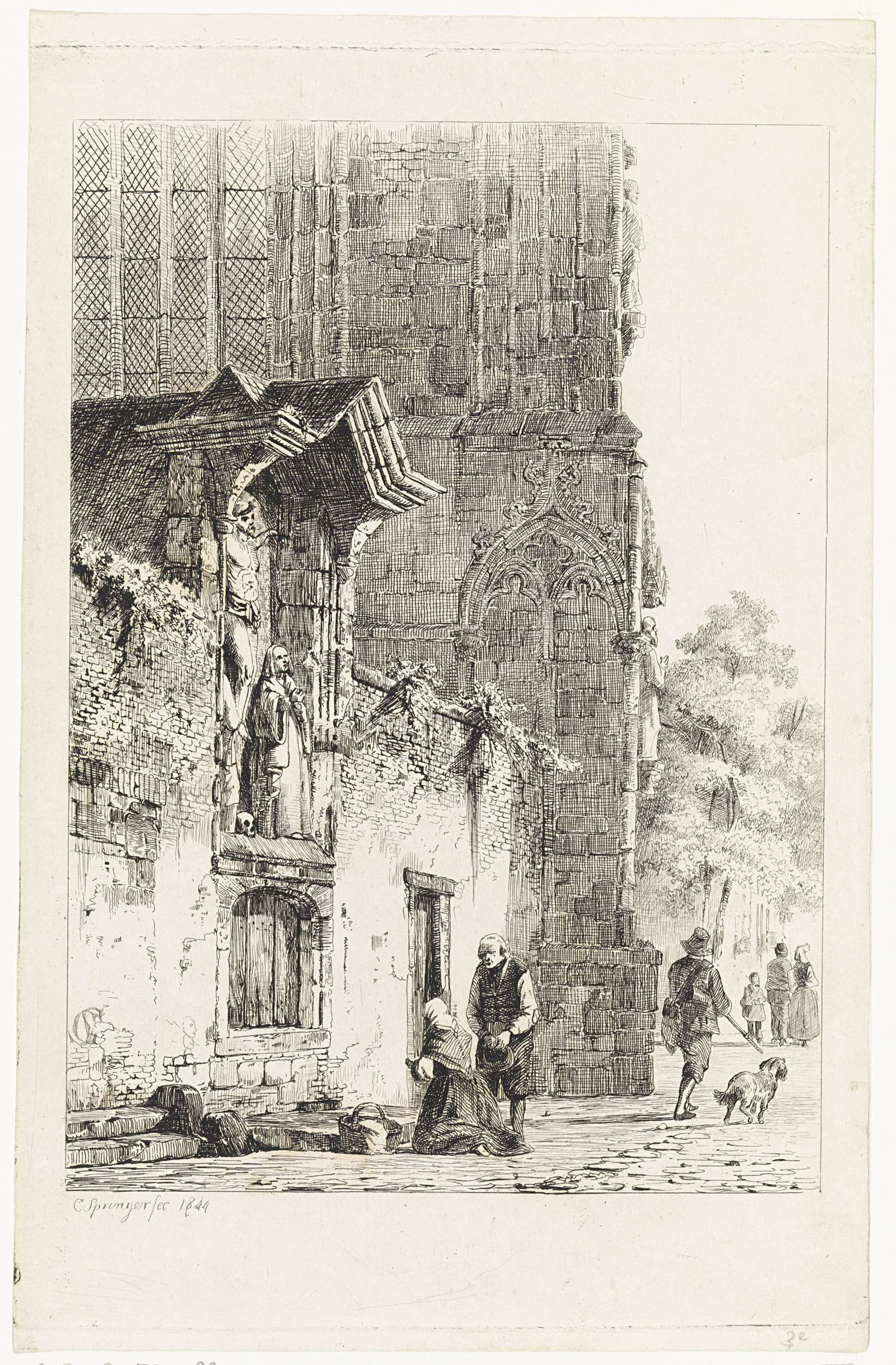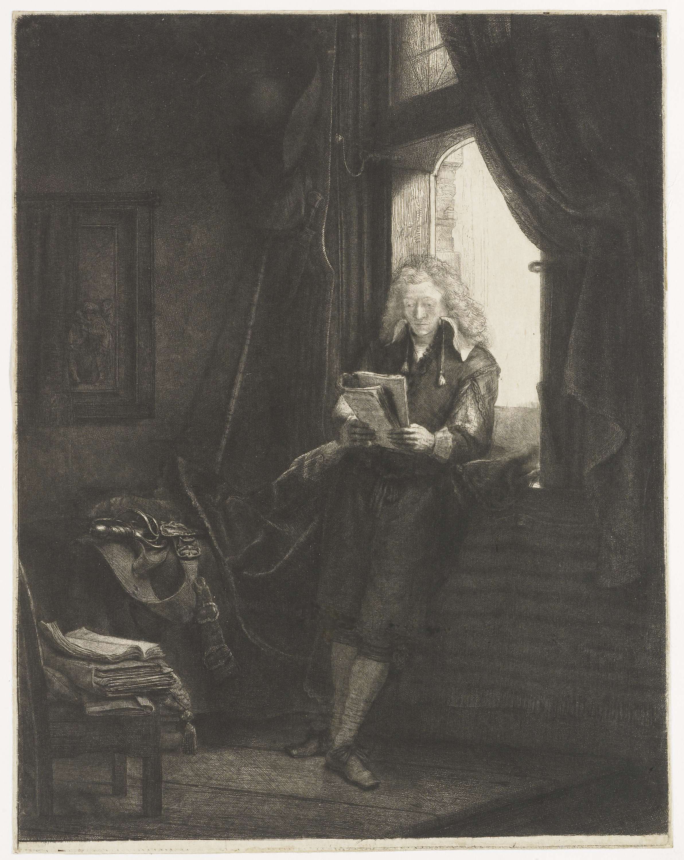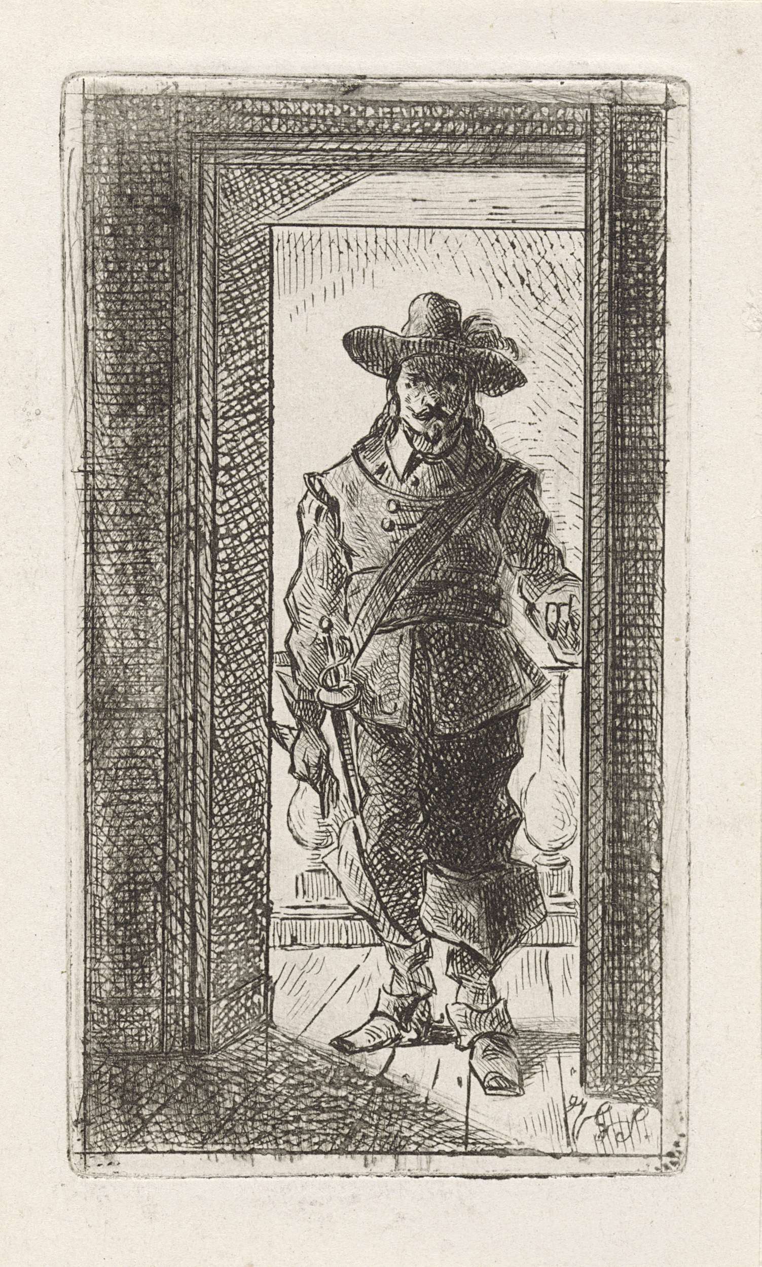 Man in zeventiende eeuwse kledij, staand in een deur...