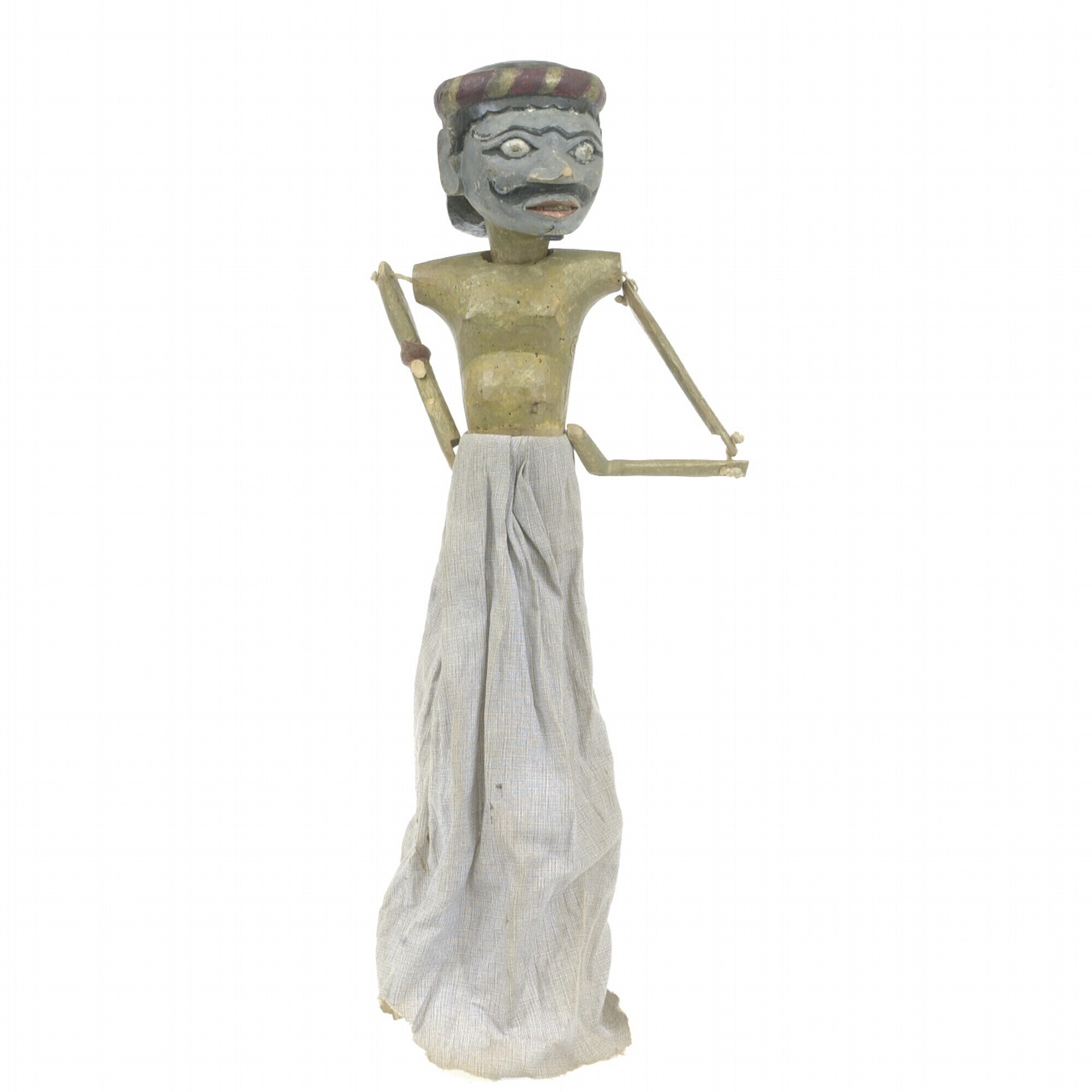 Ronde houten wayangpop (golek) voorstellend een mann...