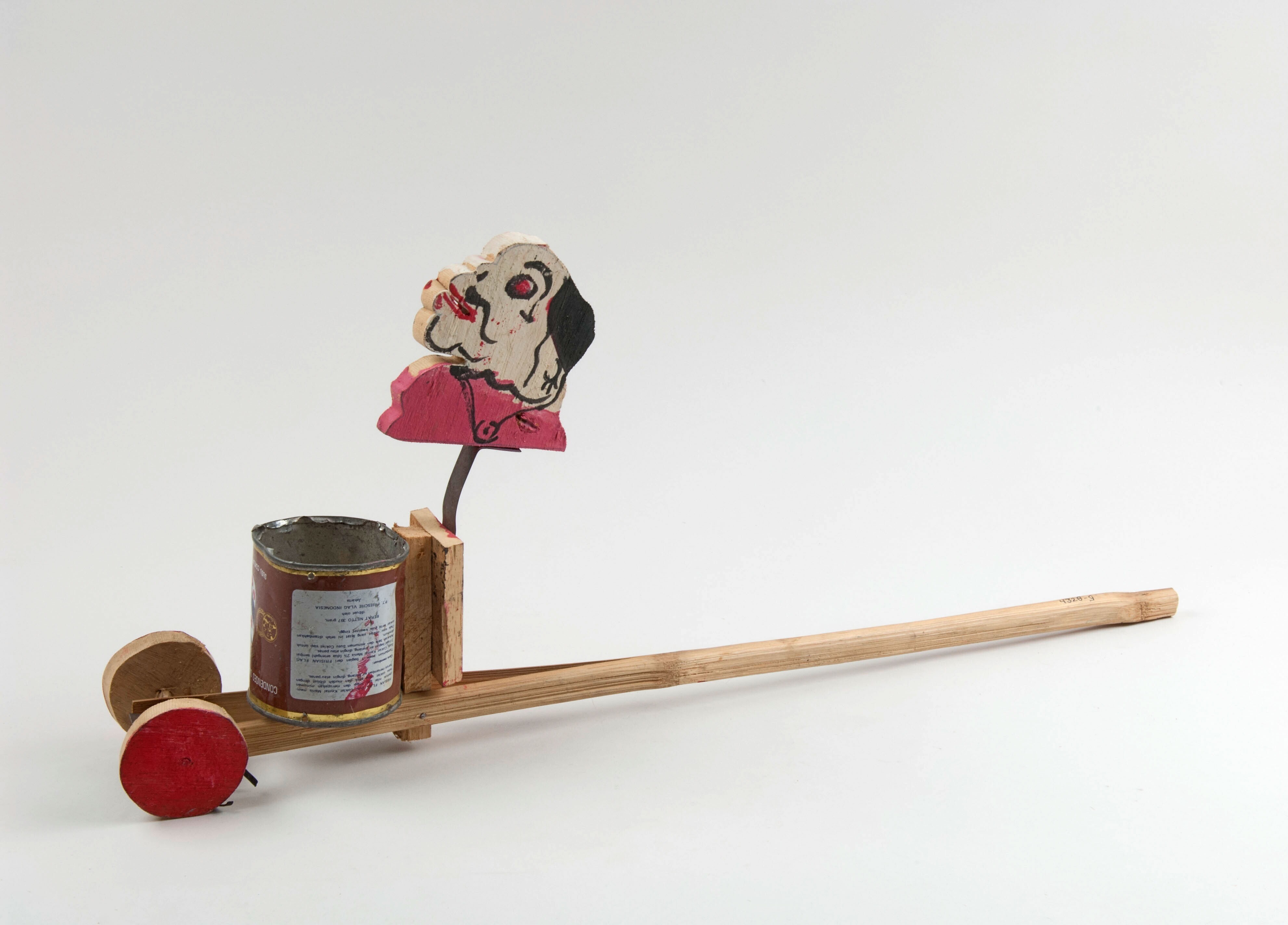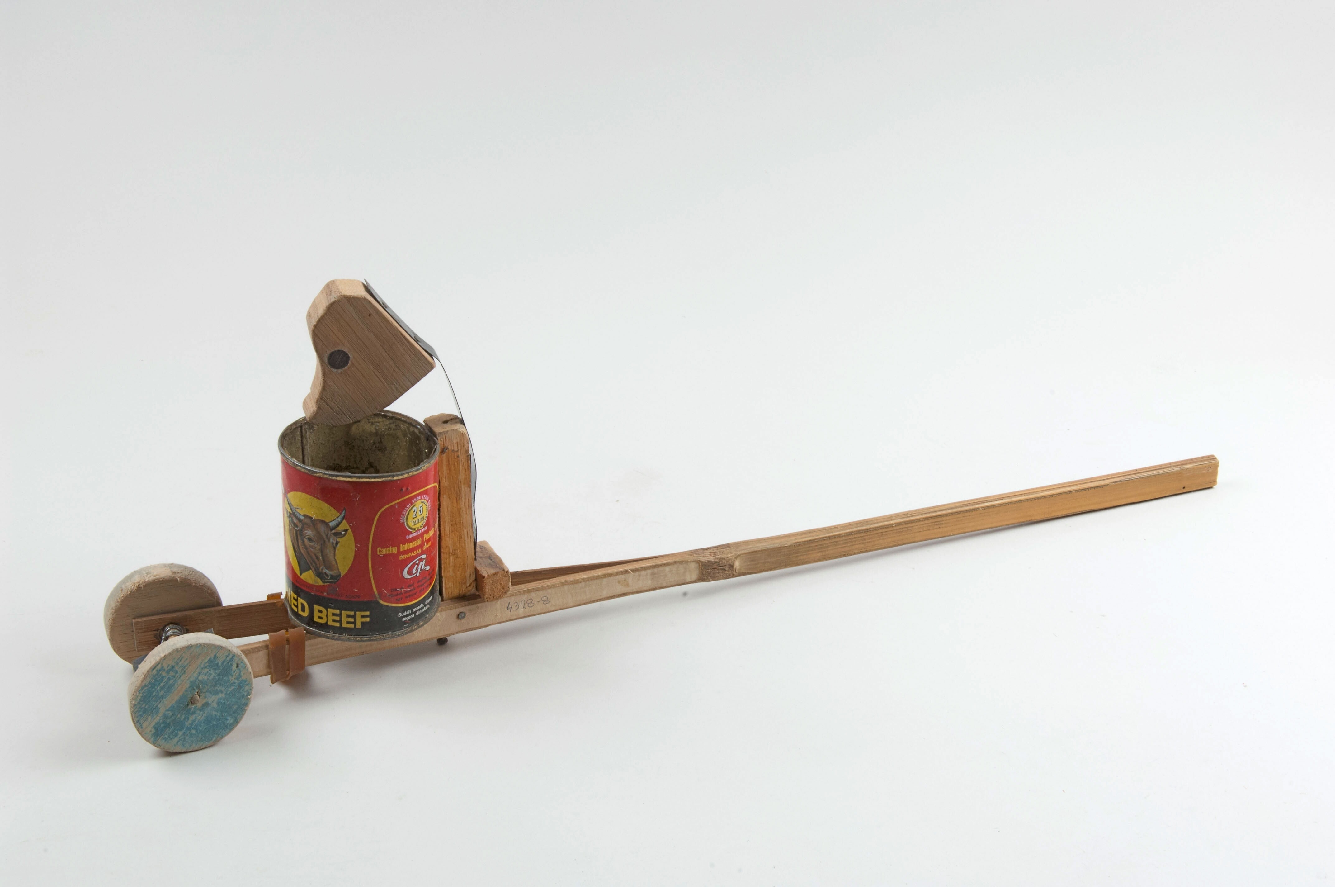 Een blikken speelgoed waterketel (a) met (deksel b)