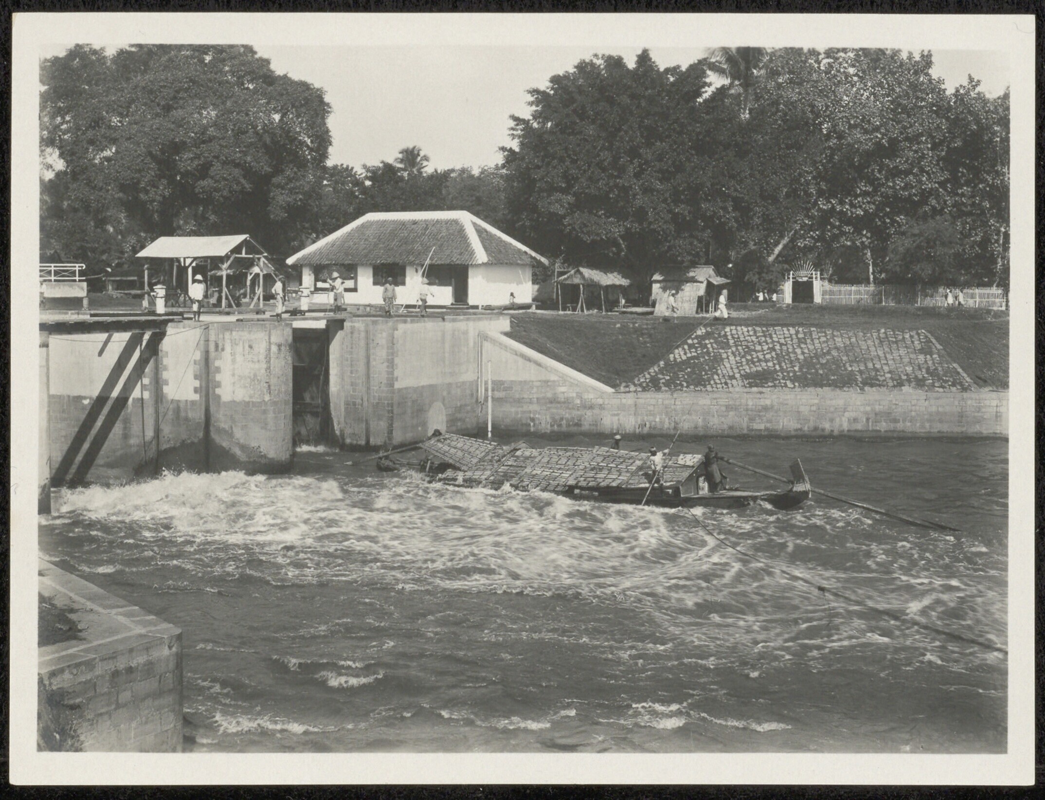 Prauw passeert schutsluis, Modjokerto