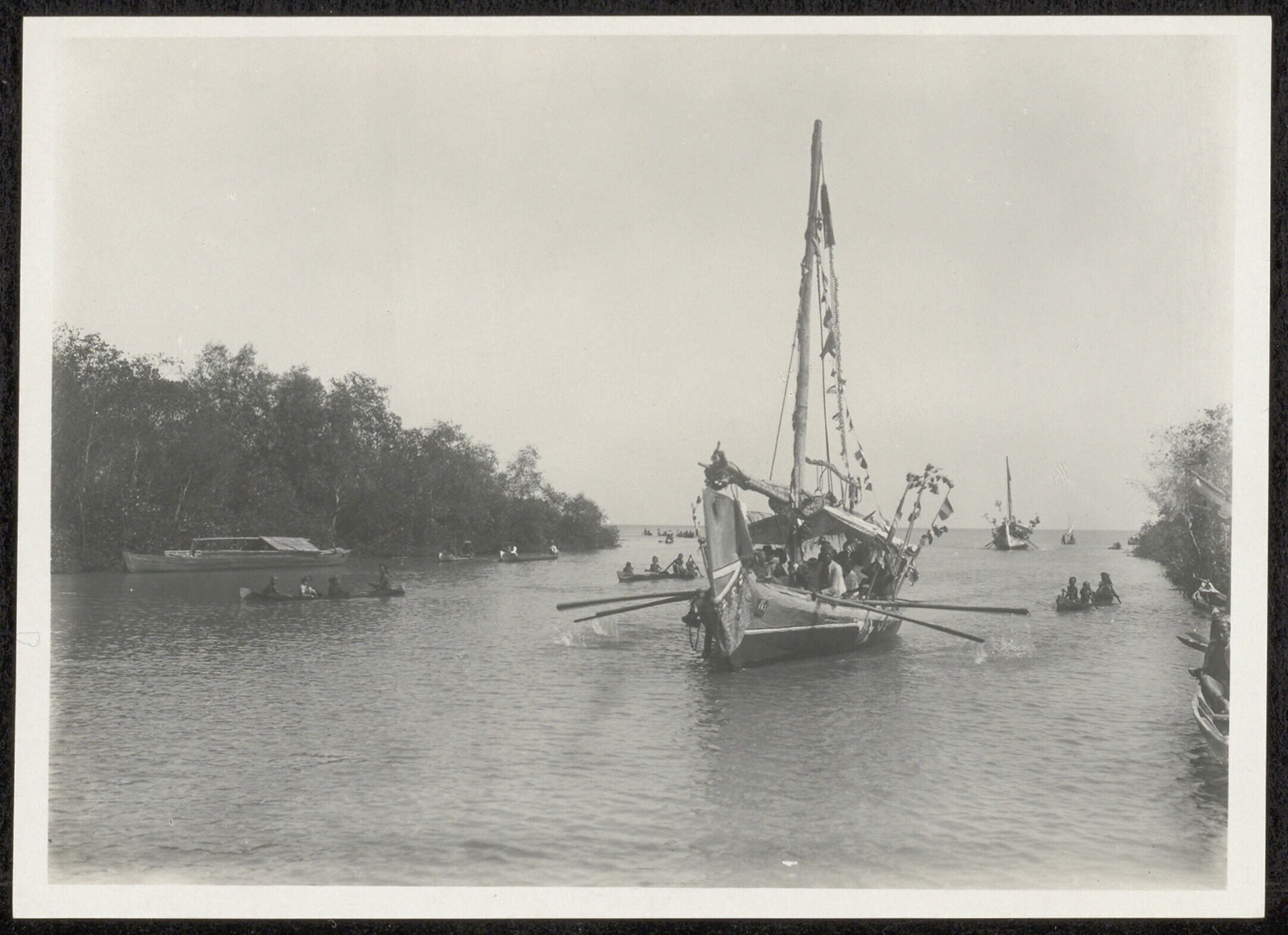 Versierde prauwen varen riviermonding op
