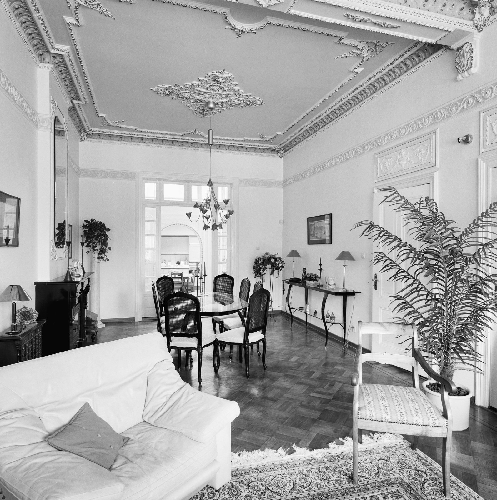 Interieur, overzicht kamer met stucwerk en stucplafond