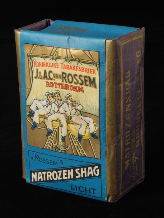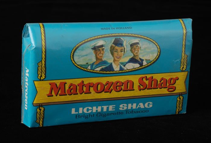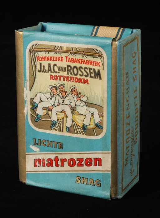 Blauw pakje tabak van Van Rossem, productnaam Matroz...