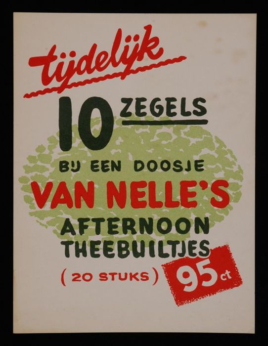 Klein reclamebord voor 10 zegels bij Van Nelle's "AF...