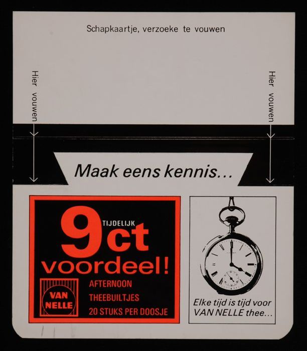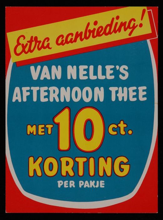 Klein reclamebord voor 10 cent korting op Van Nelle'...