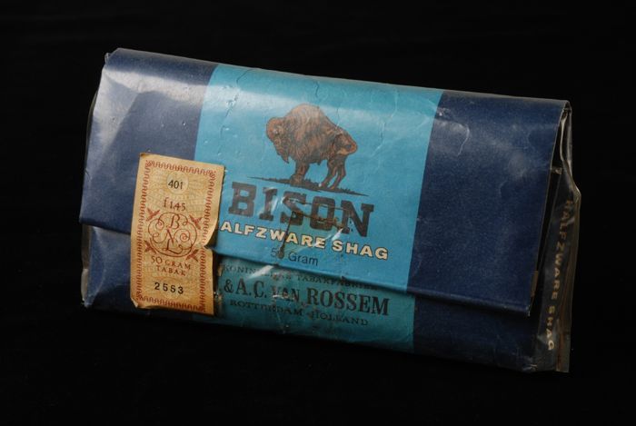 Blauw pakje tabak van Van Rossem, productnaam Bison,...