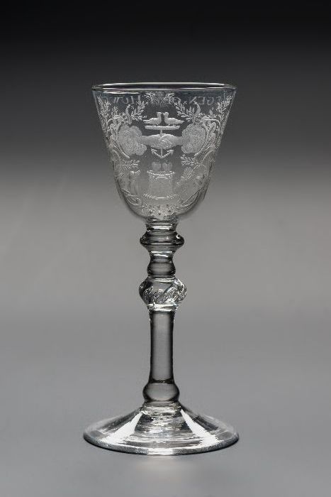Kelkglas gegraveerd met huwelijkssymbolen en tekst "...
