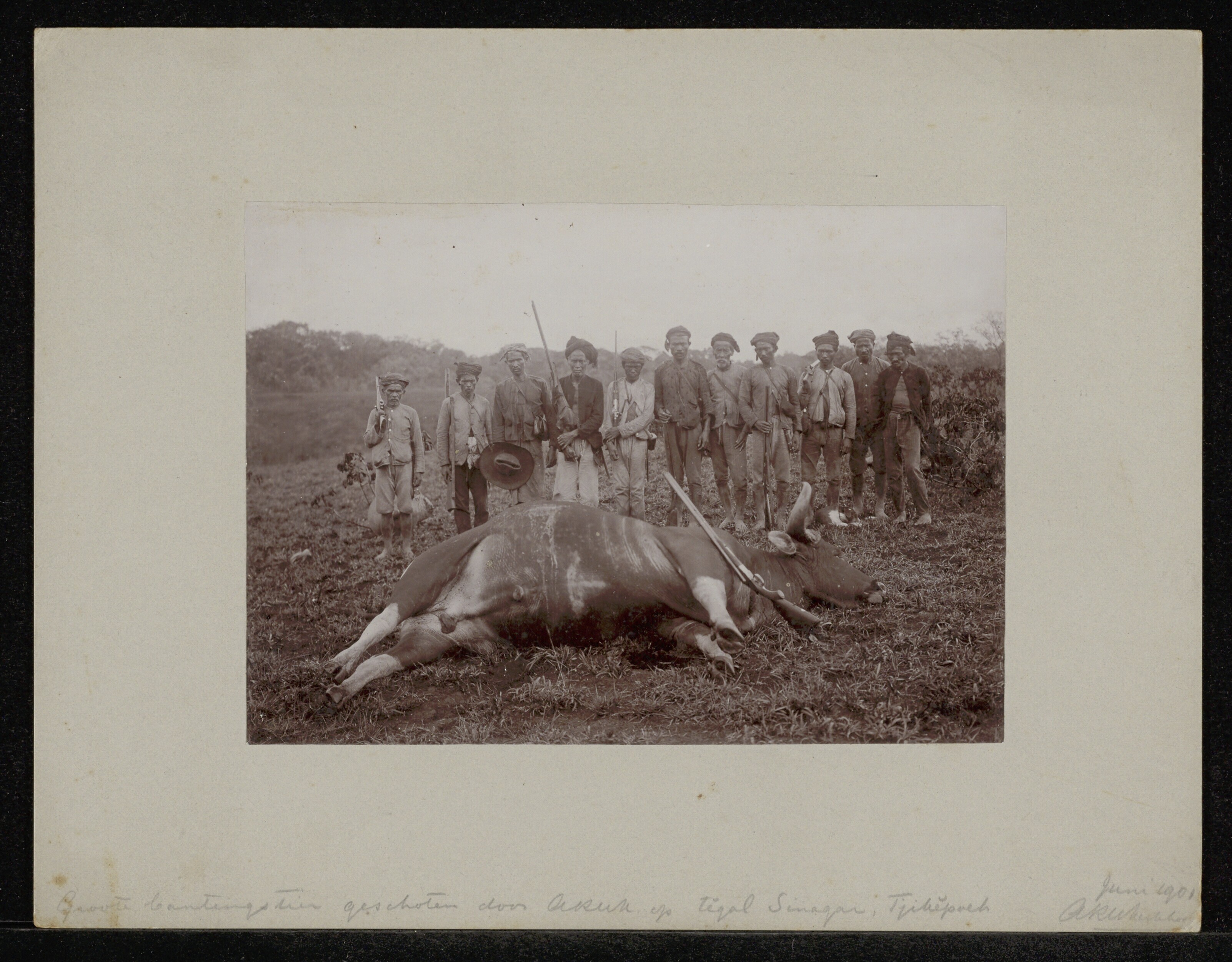 Group portrait of men standing behind a banteng bull...