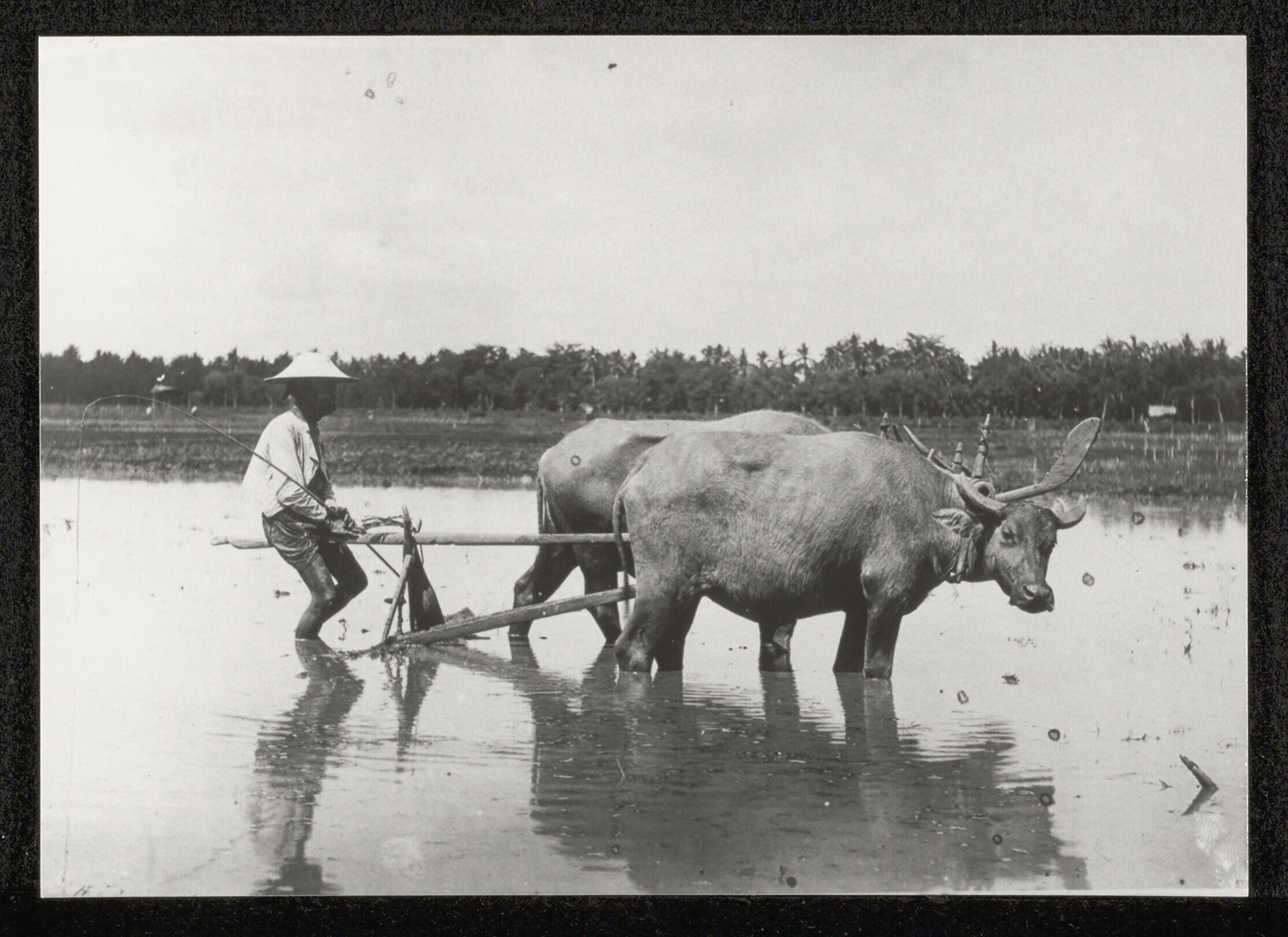 Een boer ploegt zijn rijstveld met zijn karbouwen