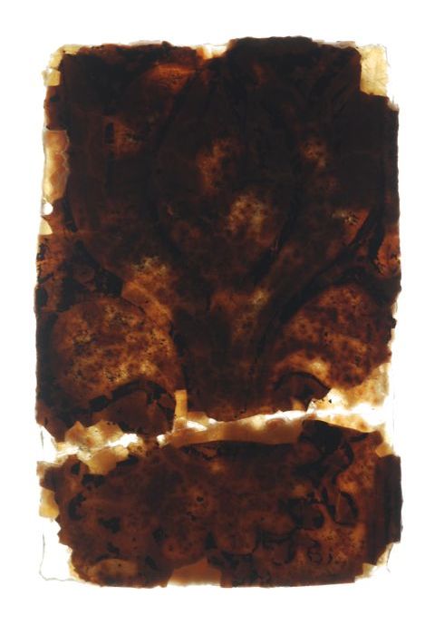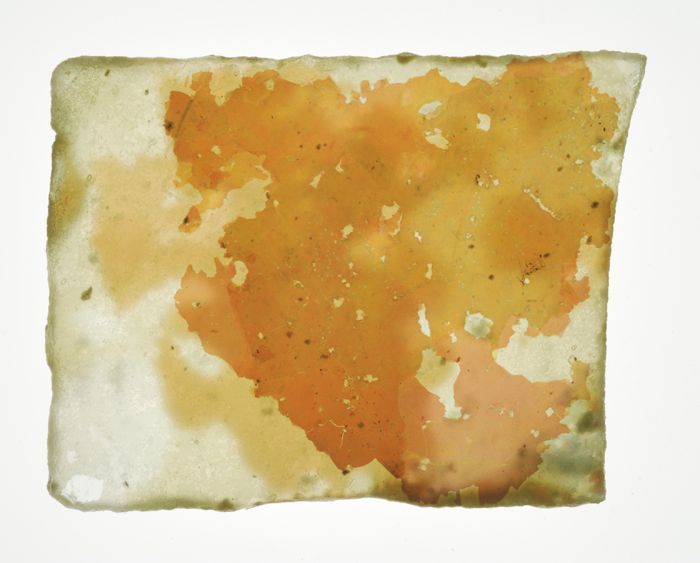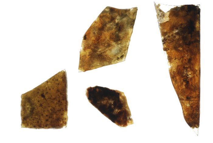 Vier fragmenten van vensterglas bedekt met dikke laa...