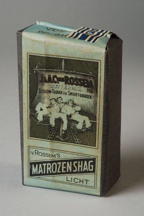 Blauw pakje tabak van Van Rossem, productnaam Matroz...
