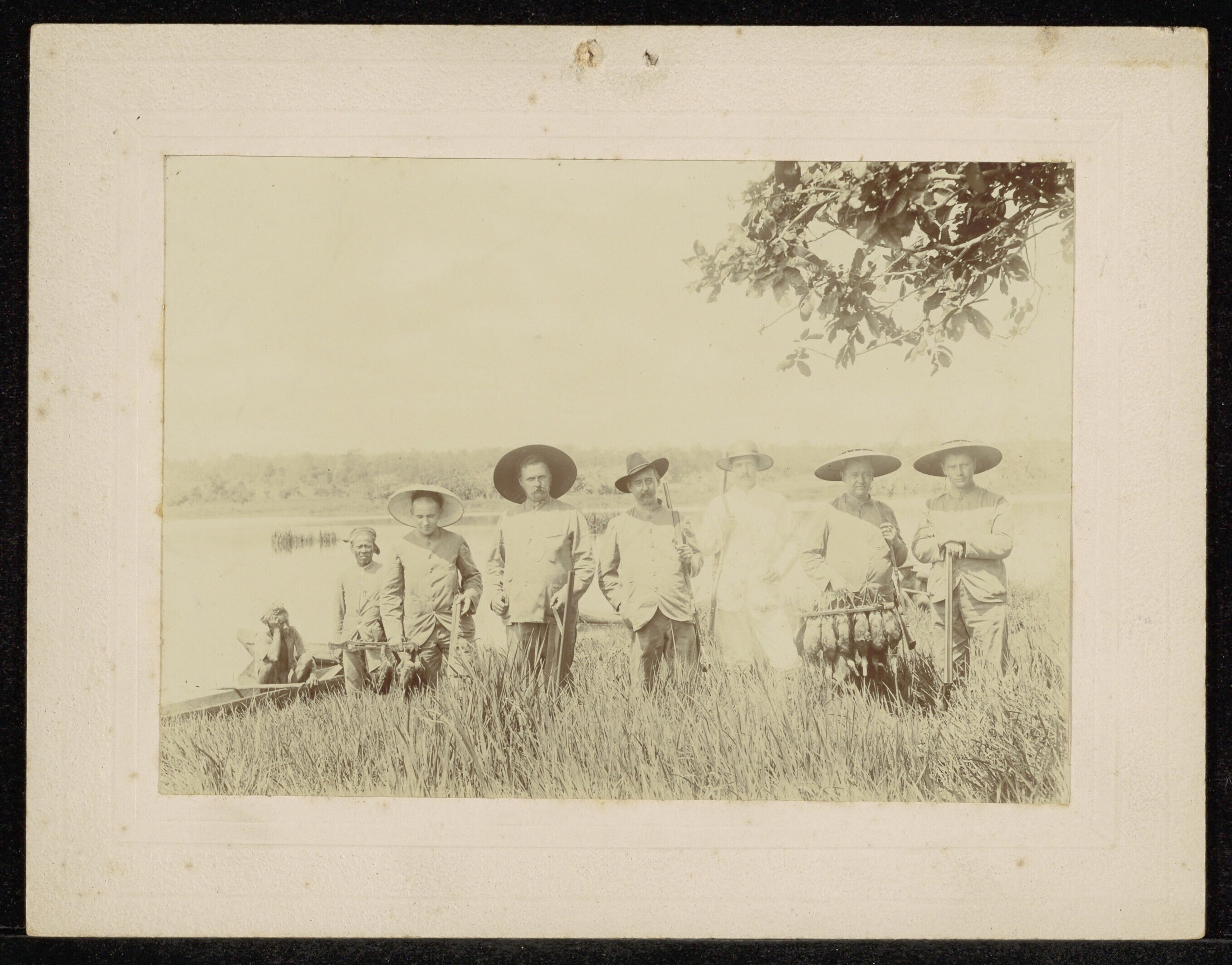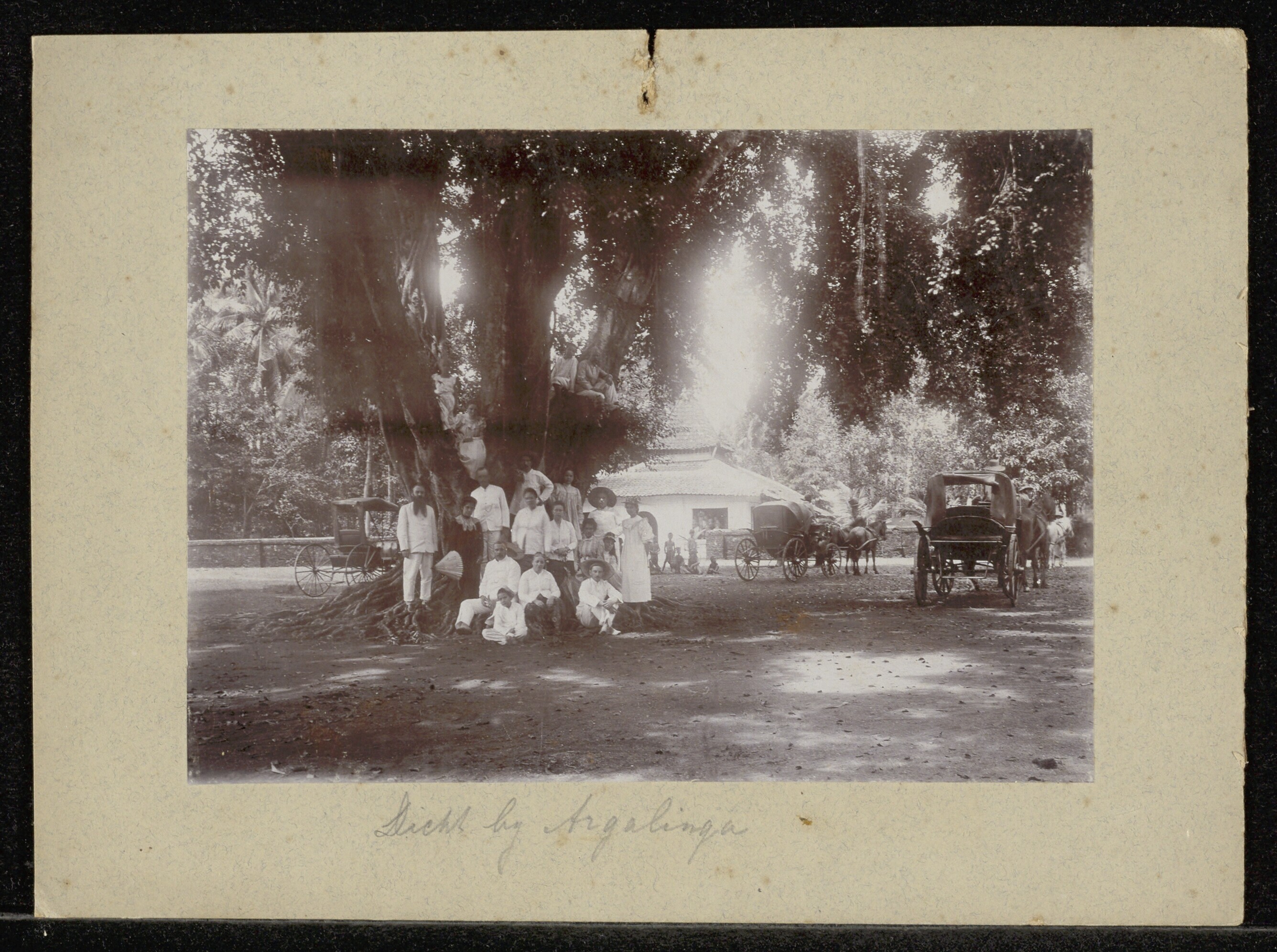 Groepsportret van Europeanen bij een boom tijdens ee...