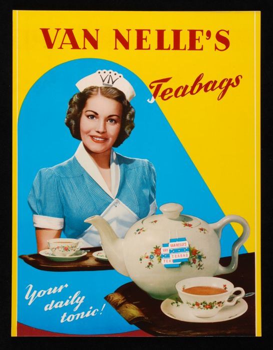 Drie reclameborden in wikkel Van Nelle's "Teabags" m...