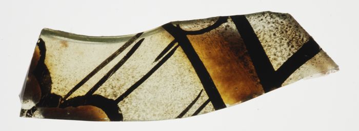 Fragment van groenig vensterglas met gebrandschilder...