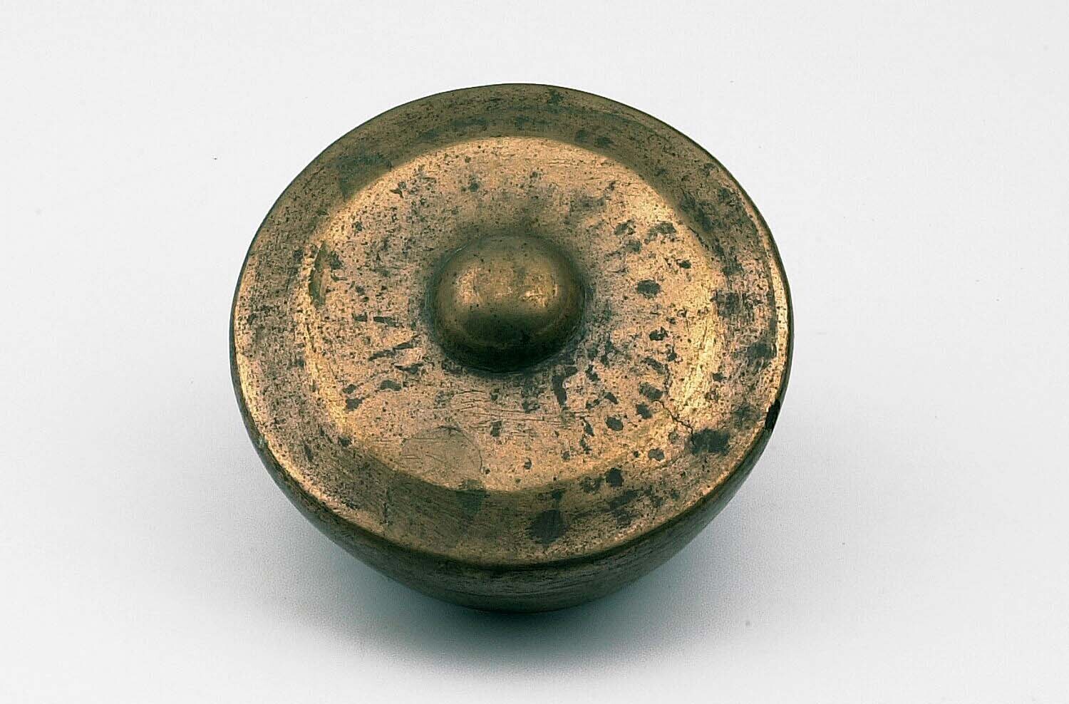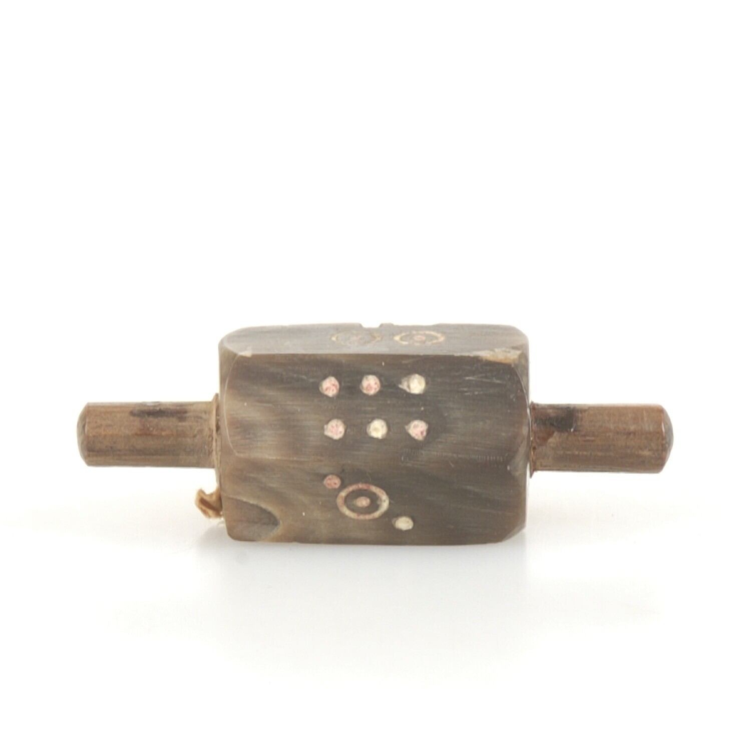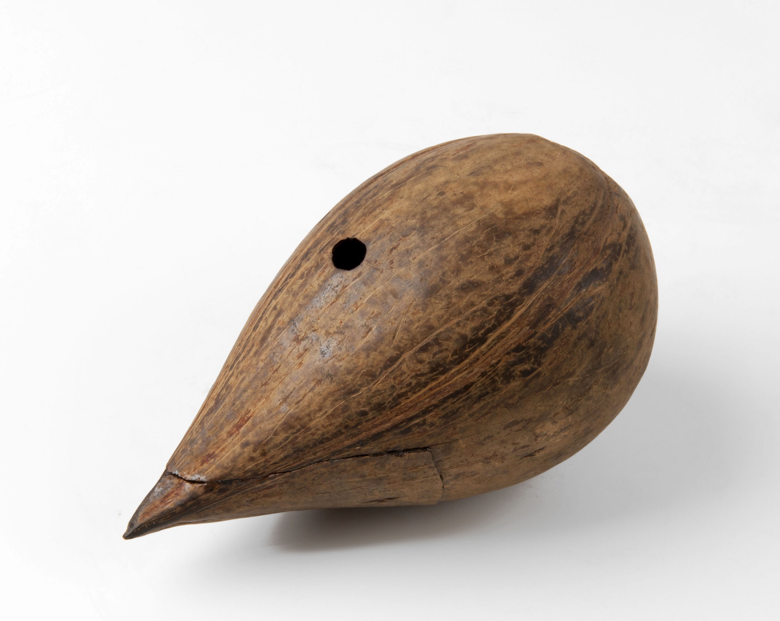 Spel bestaande uit tol (a) met etui van kokosschaal (b)