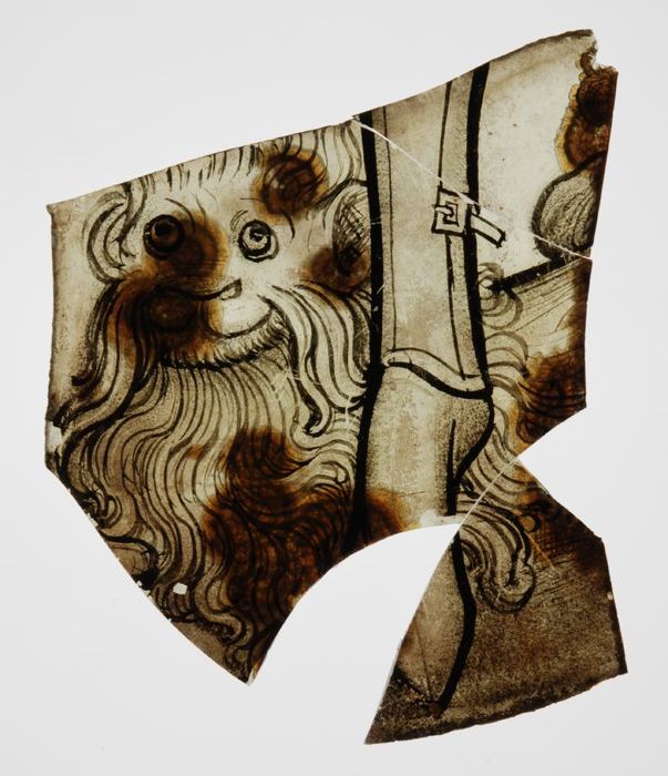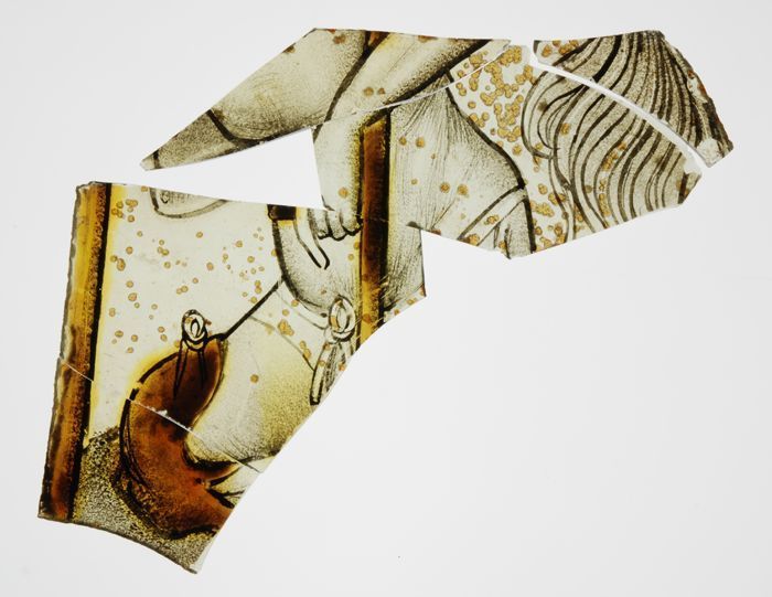 Fragmenten van groenig vensterglas met gebrandschild...