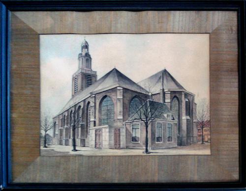 Ingekleurde tekening met potlood en inkt. Grote Kerk...