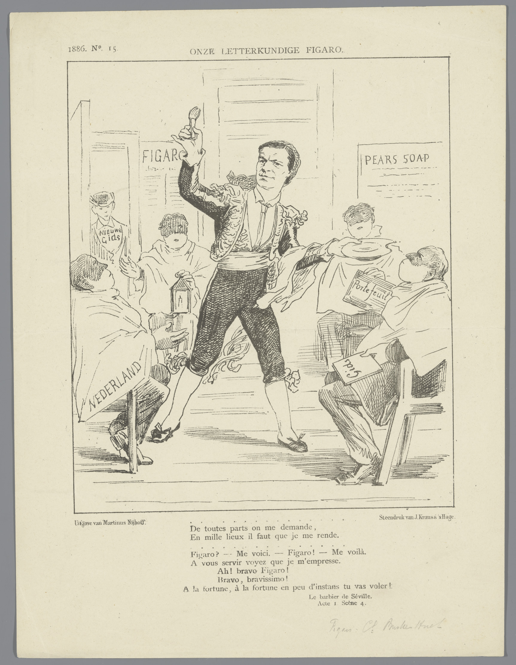 Spotprent op Busken Huet als Figaro, 1886