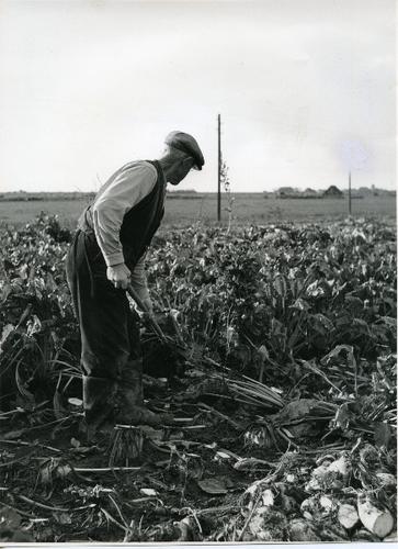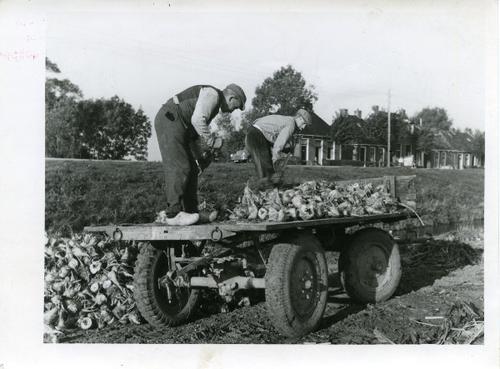Foto in zwart-wit van het lossen van bieten, 1951