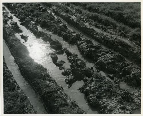 Foto in zwart-wit van modderige wagensporen in grasl...