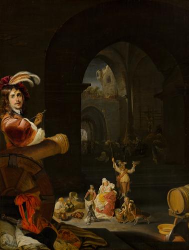 Soldaten en andere figuren tussen de ruïnes van een ...
