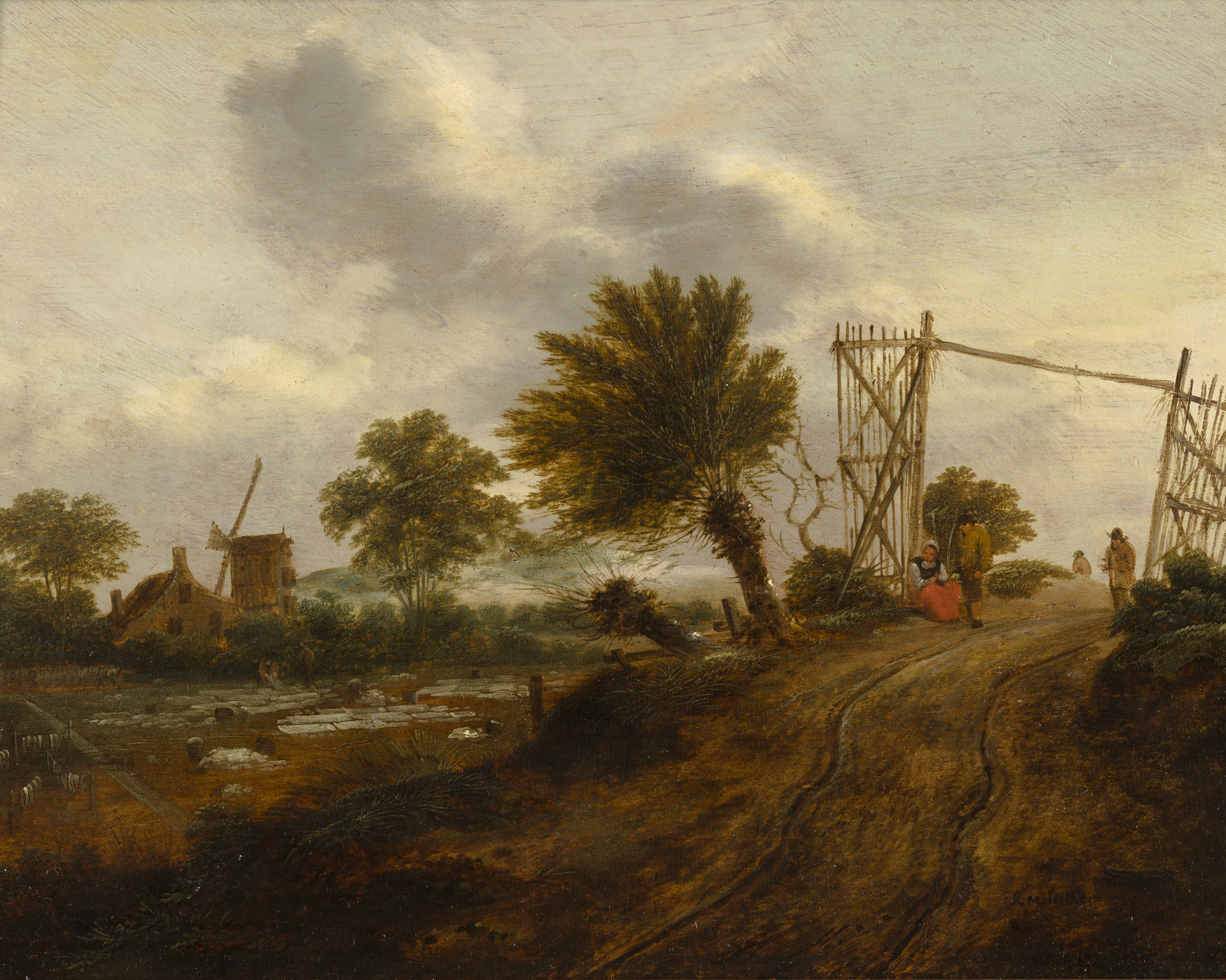Landschap met zandweg, poort en bleekveld
