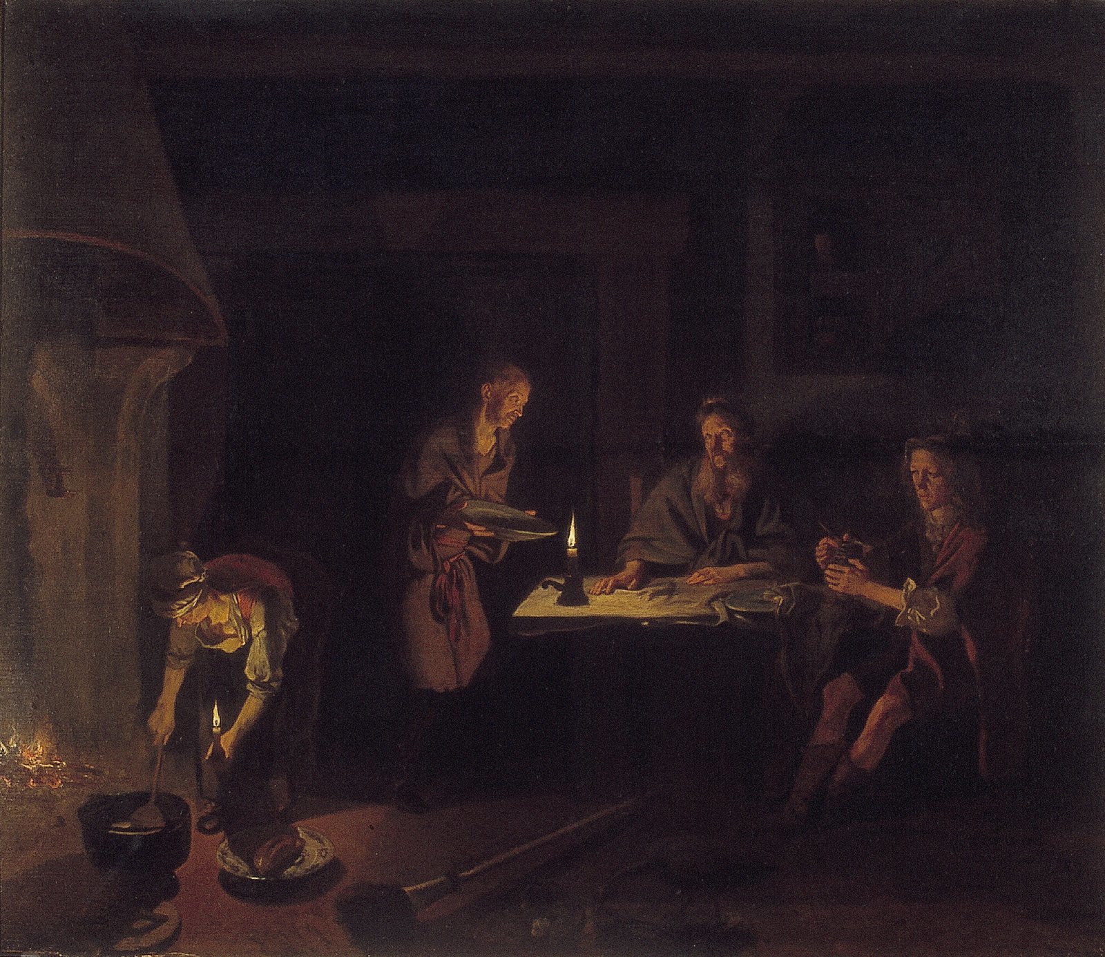 Interieur met twee mannen en een vrouw met een baby