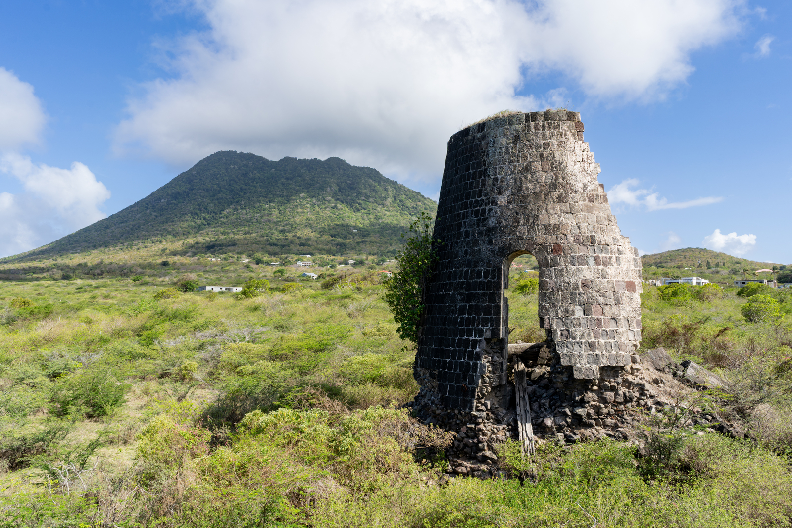 De bijna ingestorte suikermolen van plantage Fair Play.