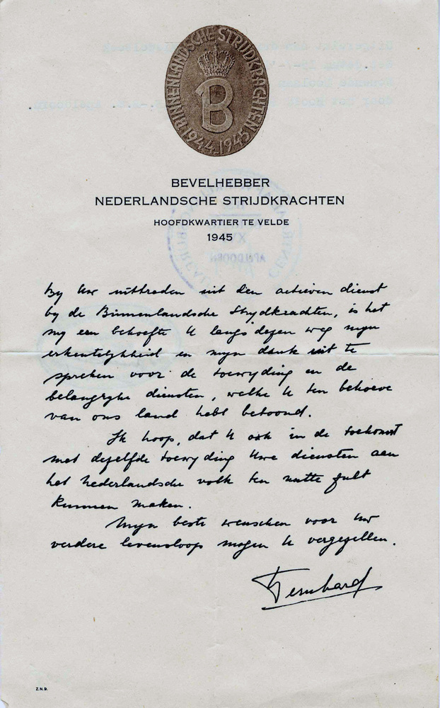 bedankbrief van Prins Bernhard, bevelhebber der Nede...