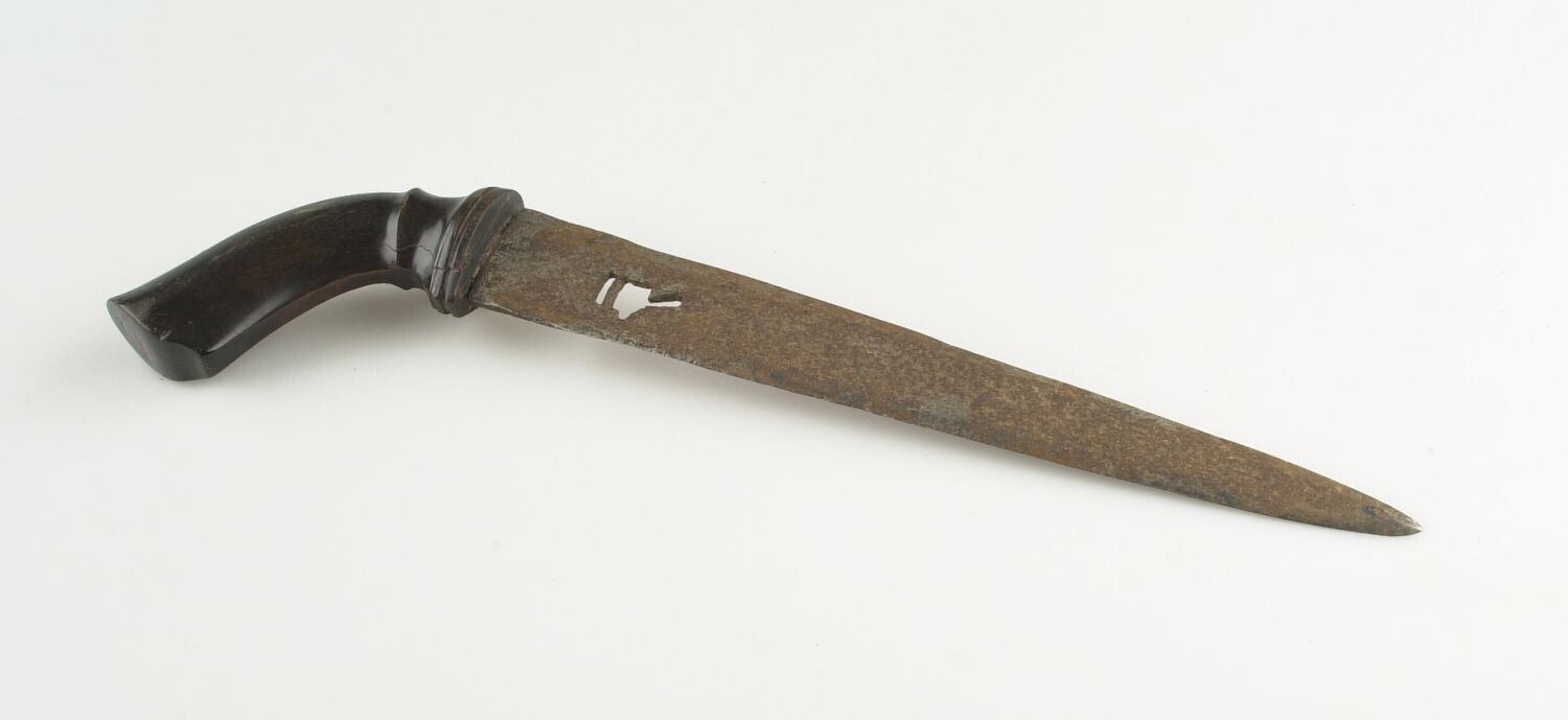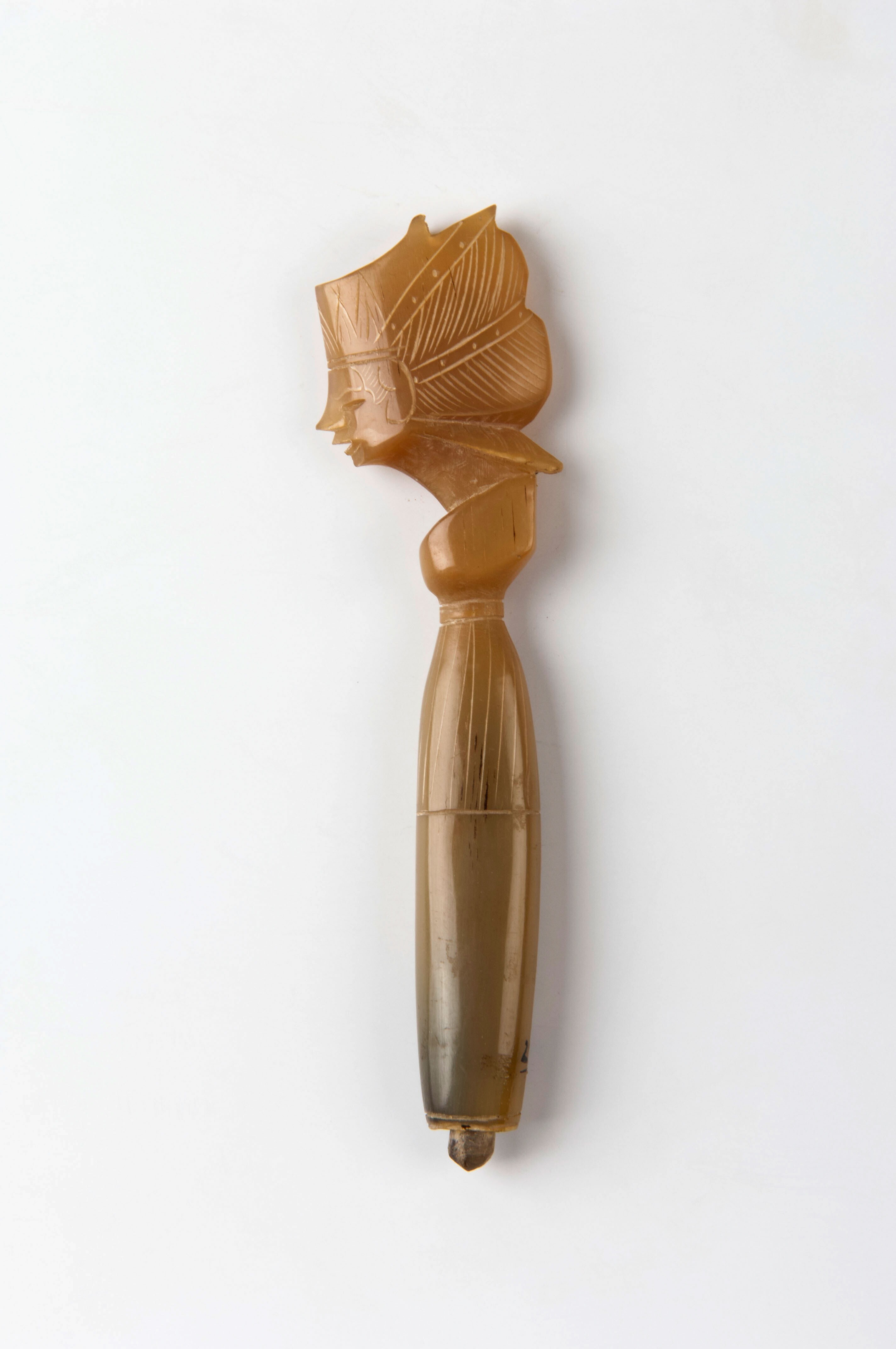 Handvat van karbouwenhoorn met wayangachtige figuur