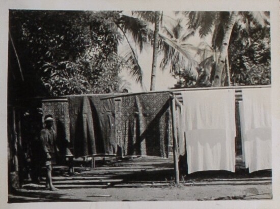Doeken, waarvan sommigen met batik, hangen aan rekke...