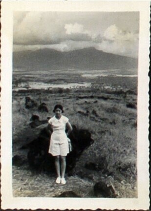Vrouw kijkt uit over de Zwitsersche pas, voorbij Pam...