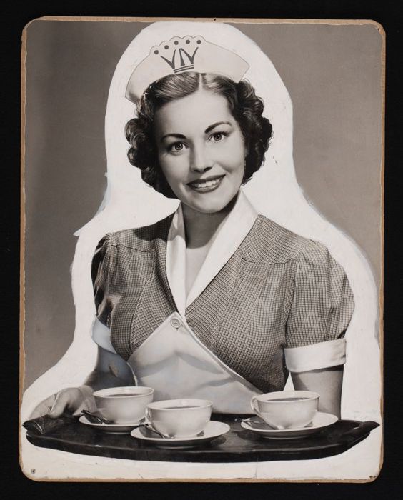 Opgeplakte zwart/wit foto van Nellie, een dienblad i...