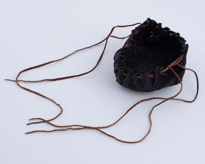 Leren geldbuidel met nieuwe veters in de rijggaten