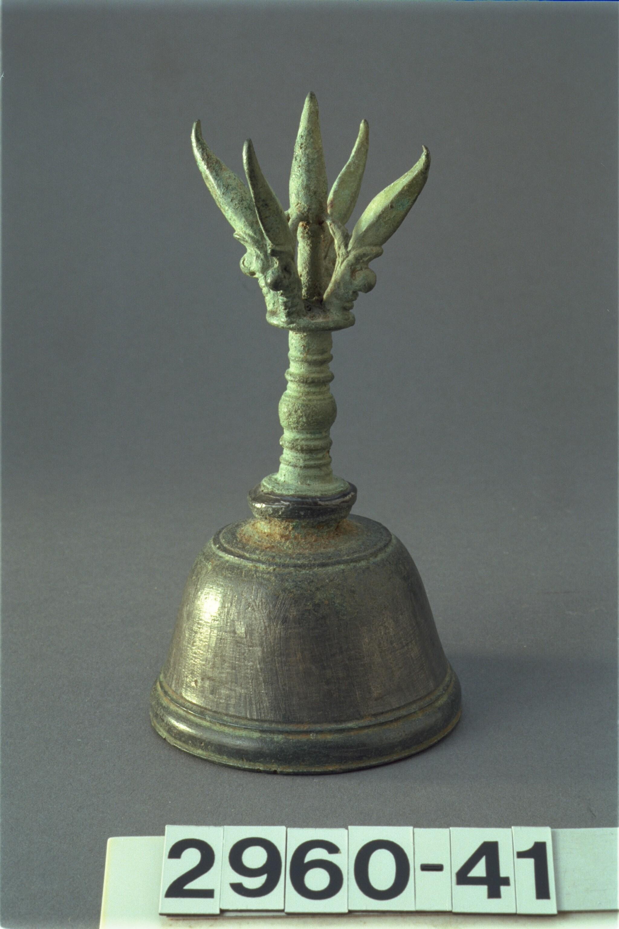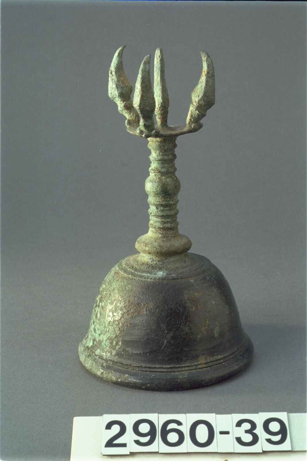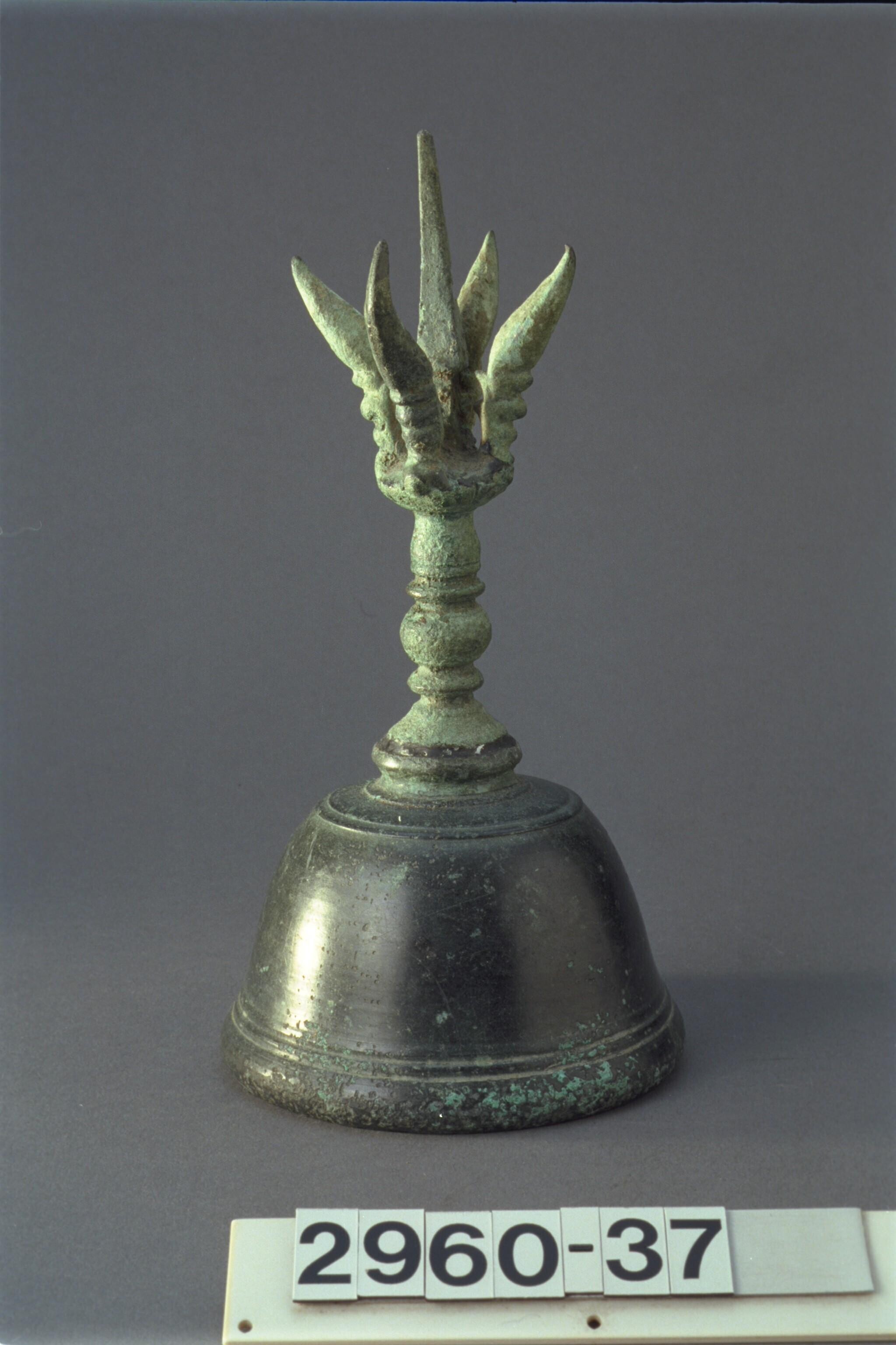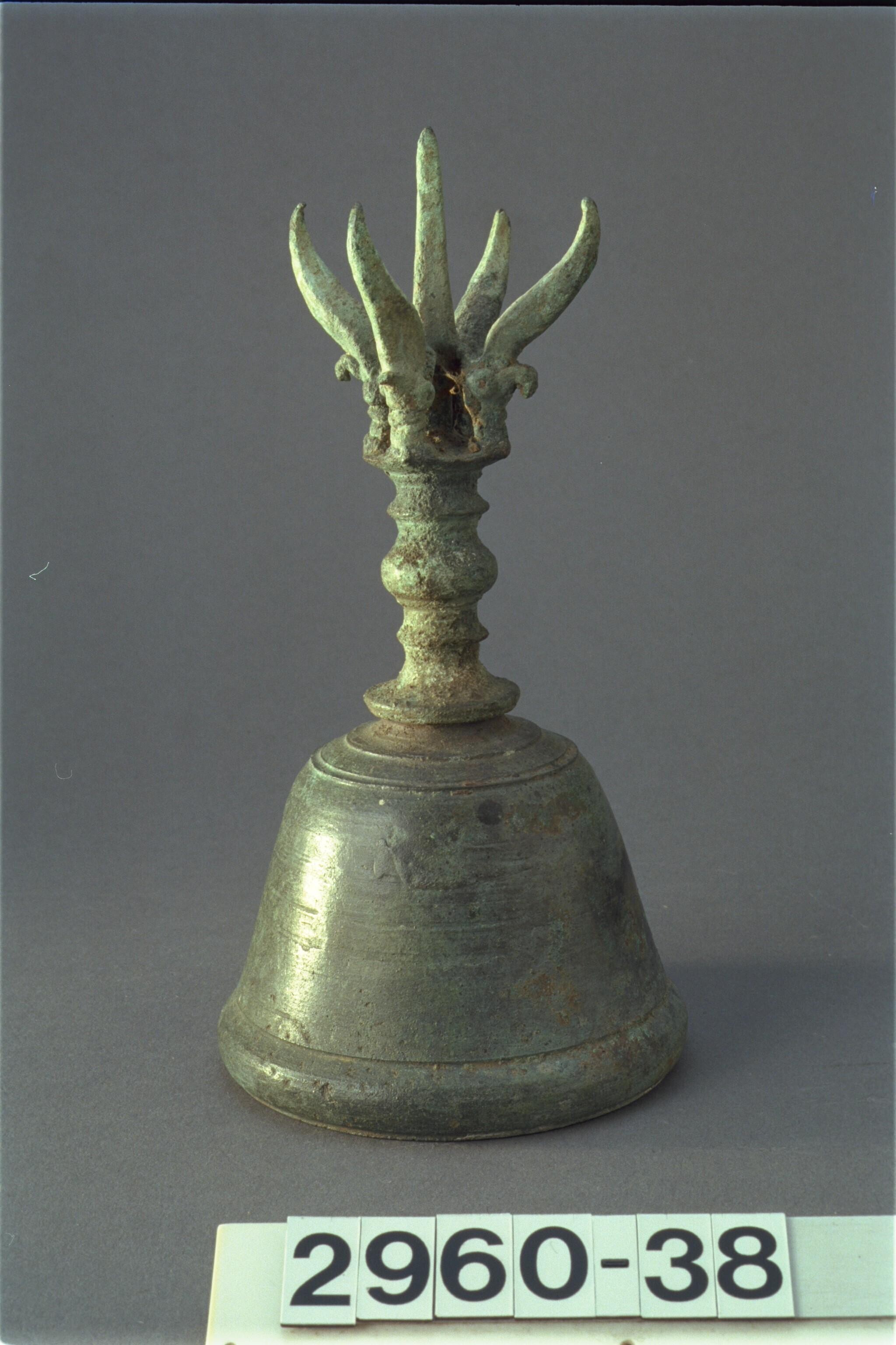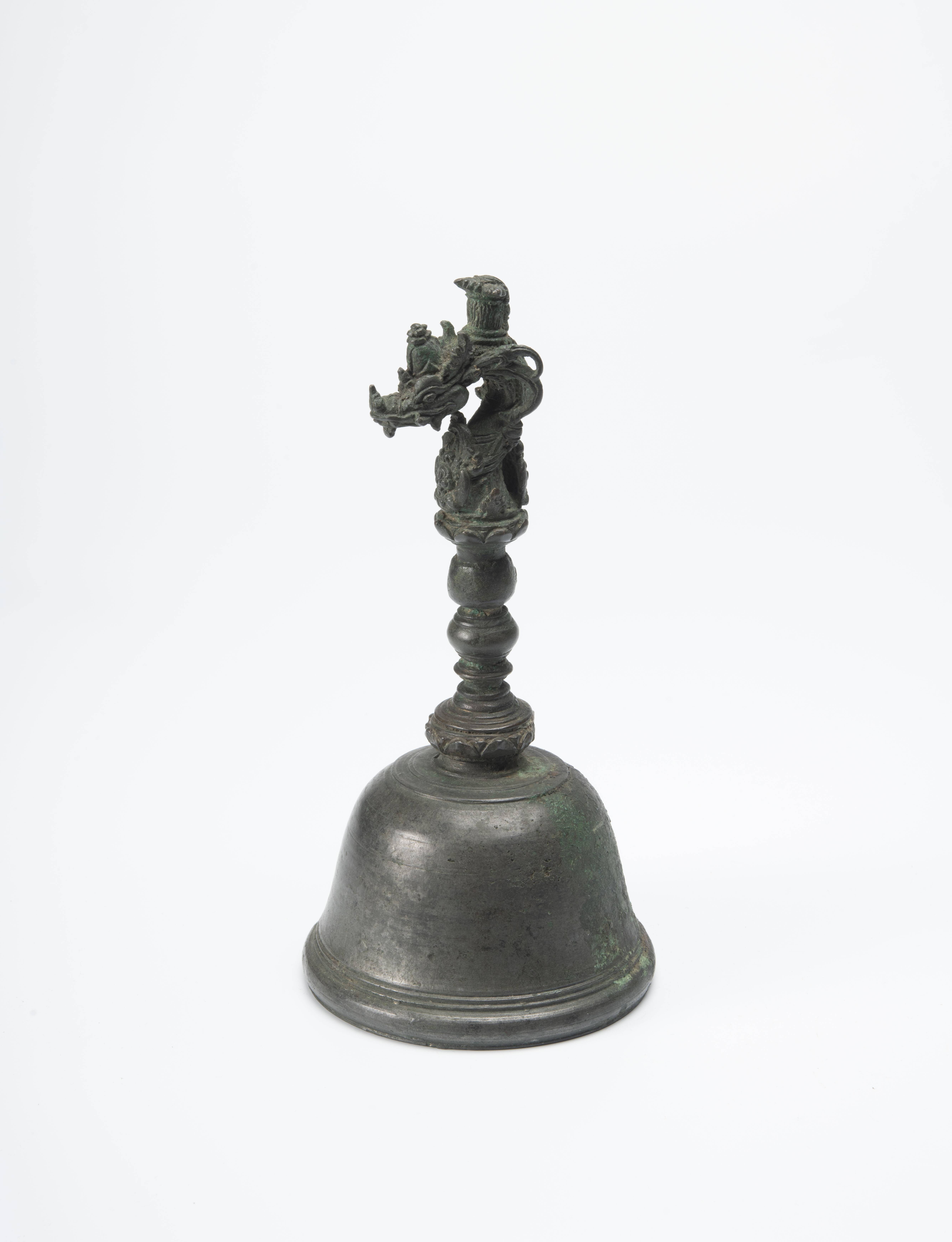 Indo-Javaanse bidschel met handvat en klepel top afg...