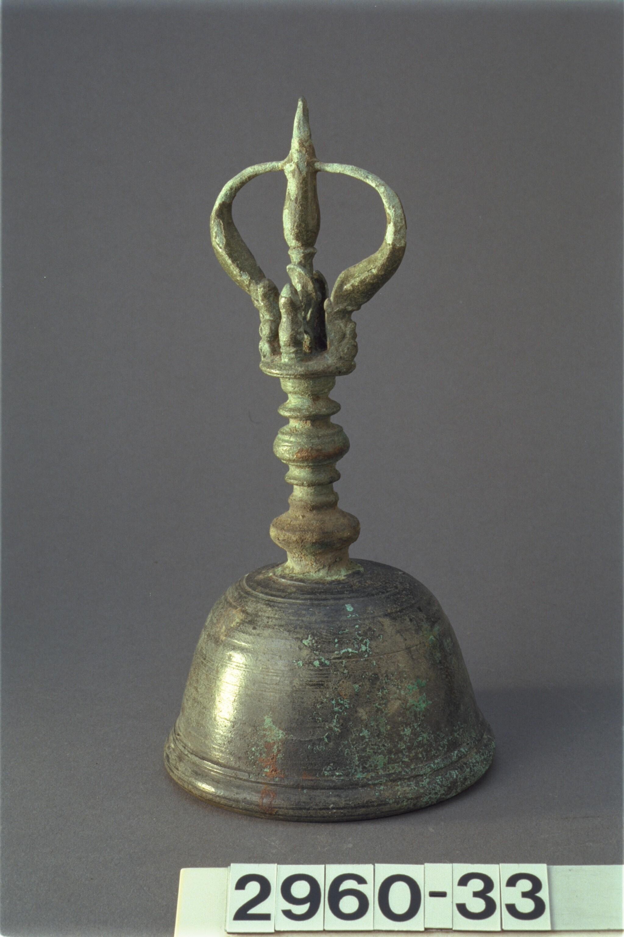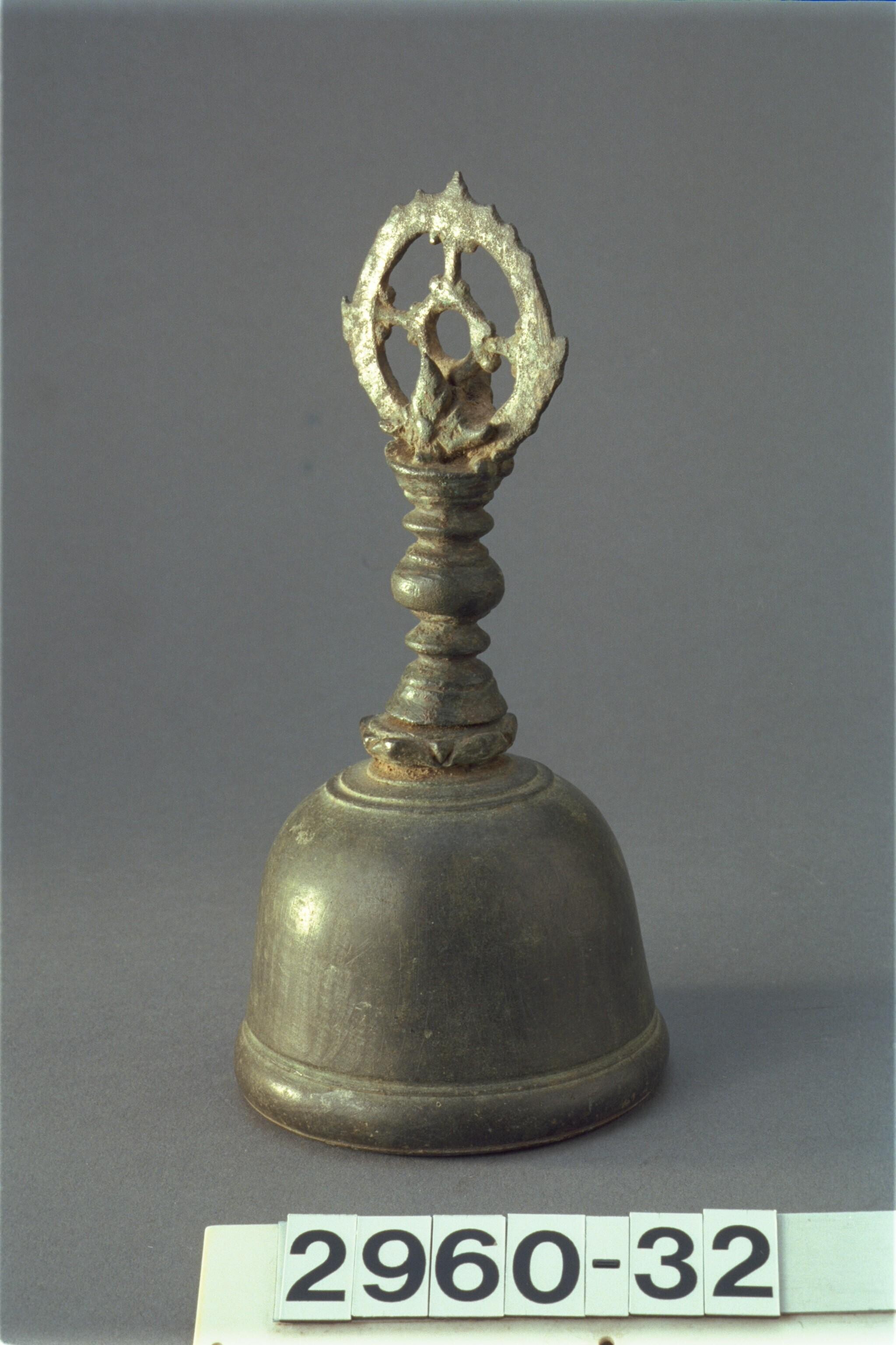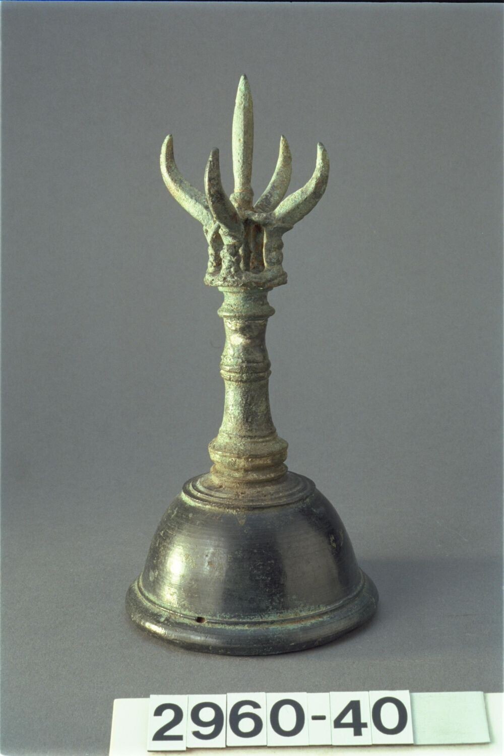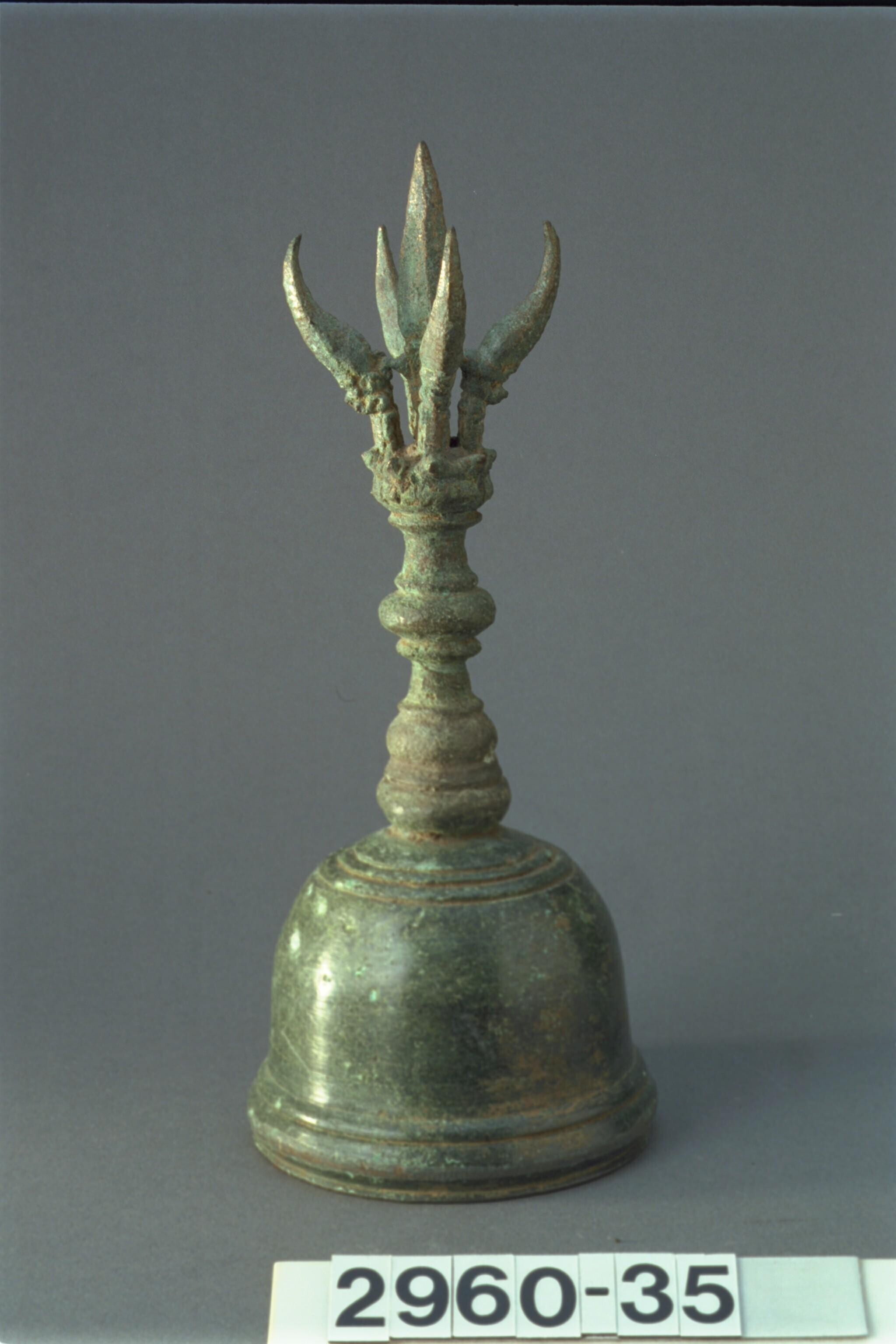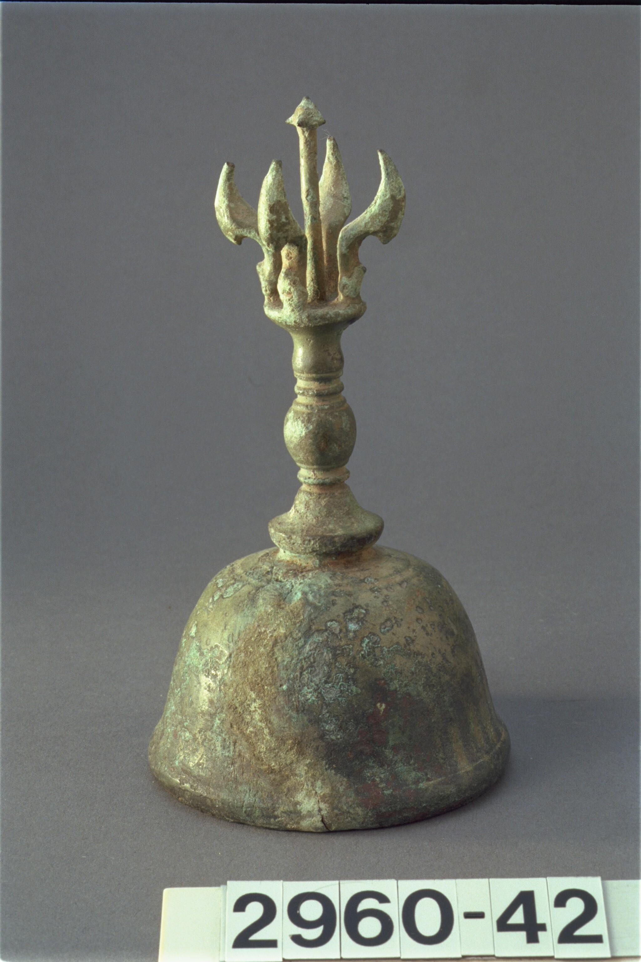 Indo-Javaanse bidschel met handvat en klepel top afg...
