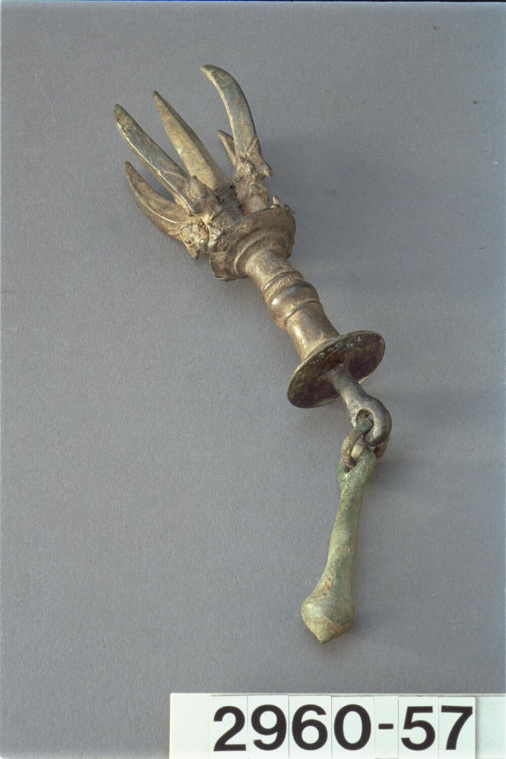 Indo-Javaanse bidschel met handvat en klepel steel m...