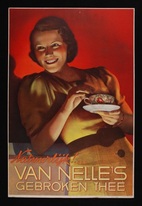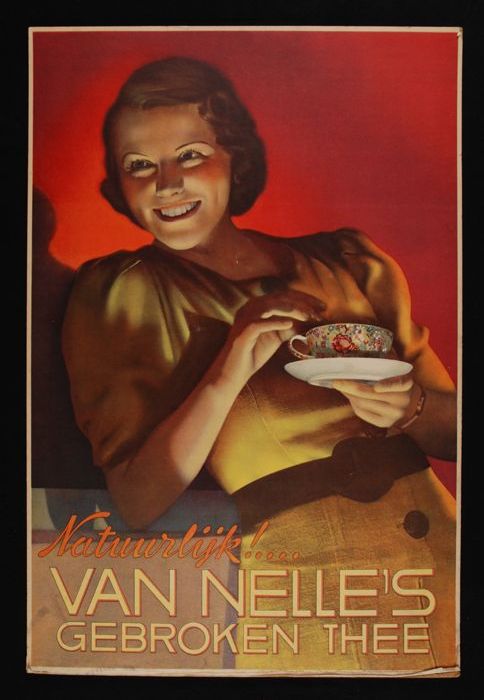 Reclamebord van Van Nelle's "GEBROKEN THEE" met vrou...