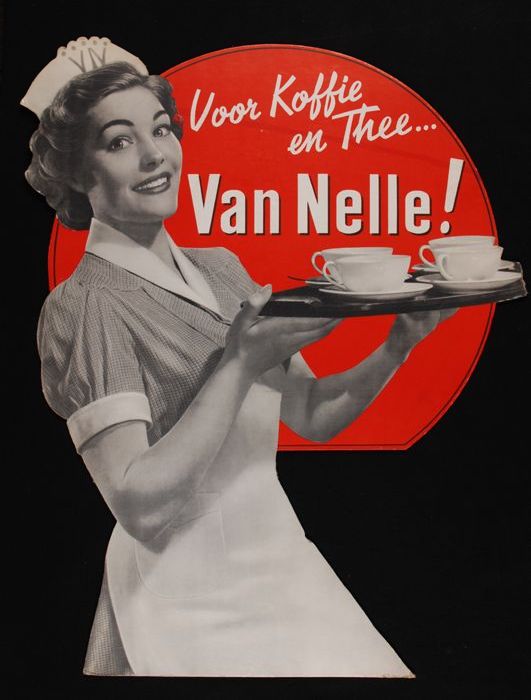Reclamebord Van Nelle's koffie met dienblad en kadogids