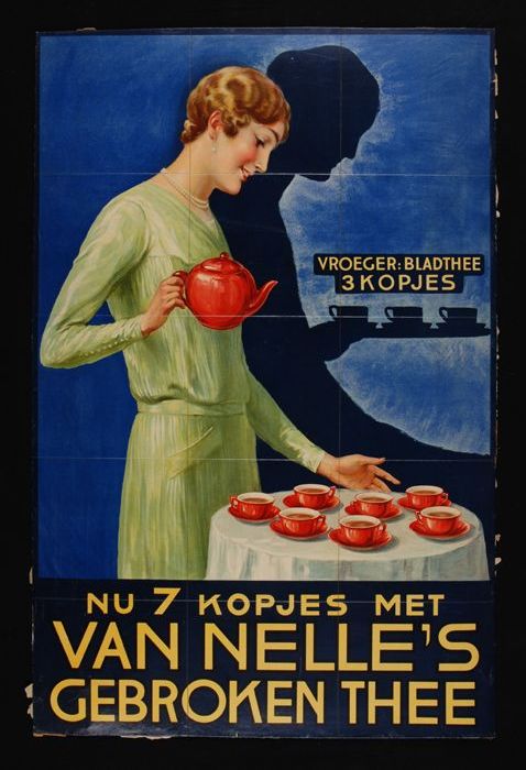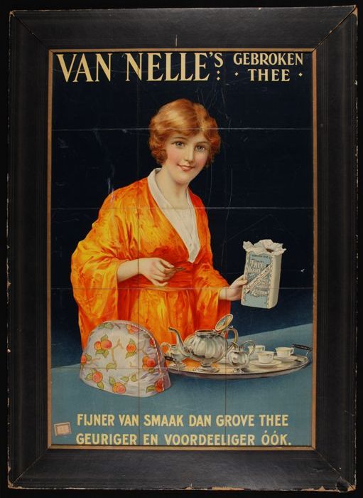 Reclamebord Van Nelle's "GEBROKEN THEE", vrouw die z...