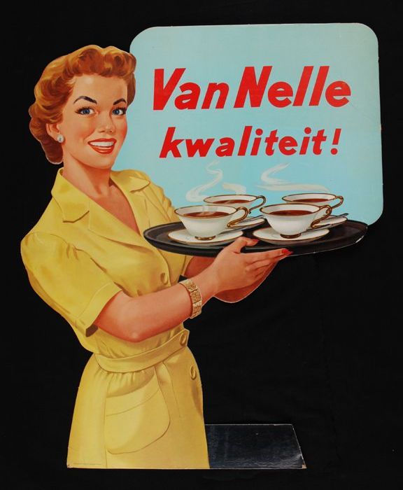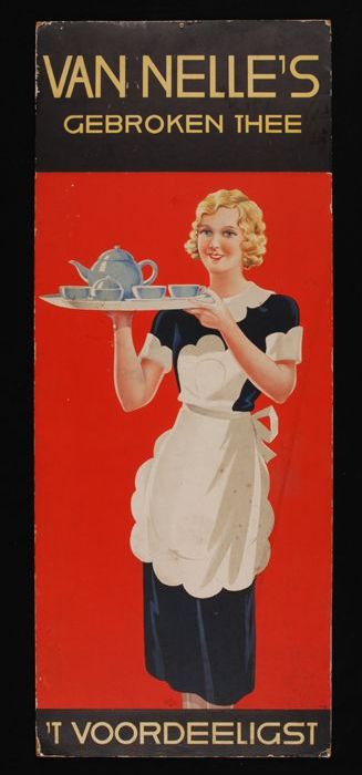 Reclamebord Van Nelle's "GEBROKEN THEE", serveerster...