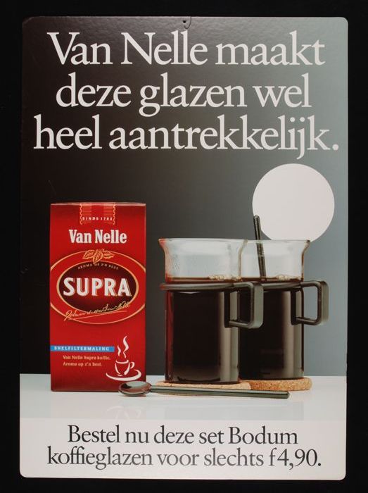 Reclamebord Van Nelle's "SUPRA" koffie met "Bodum ko...
