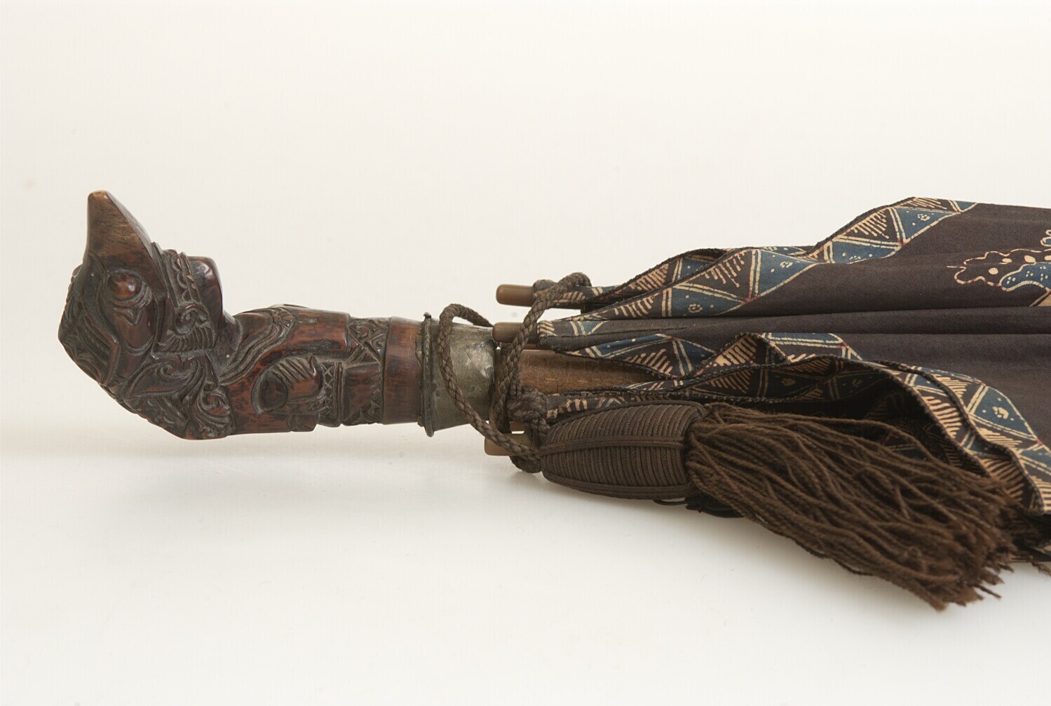 Gebatikte parasol van textiel met een houten krisgre...