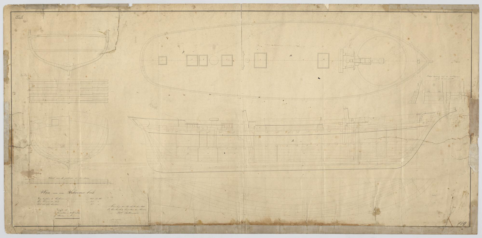 Lijnenplan van een schoenerbrik van vijf stukken