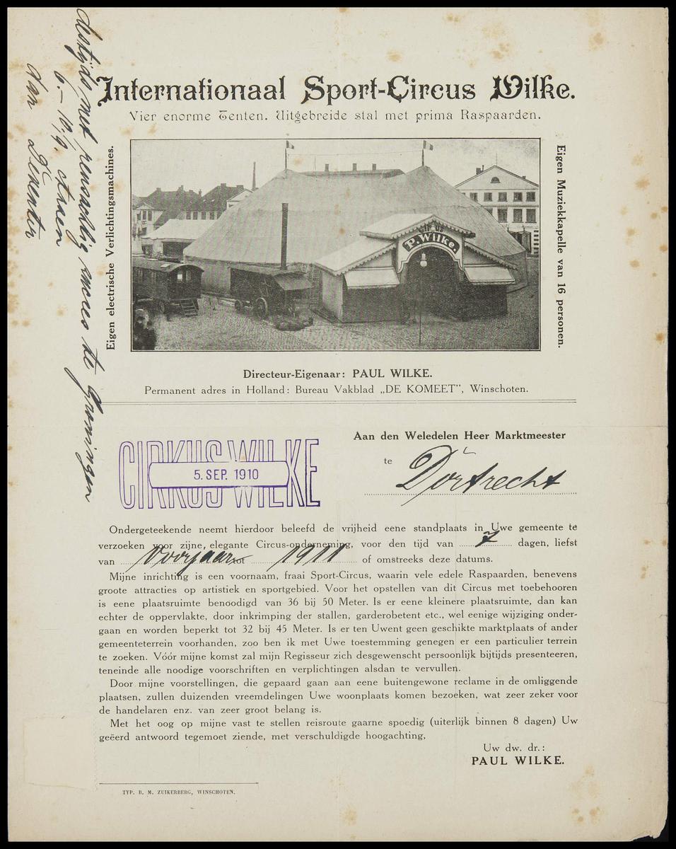 Brief Circus Wilke inzake het reserveren van een sta...