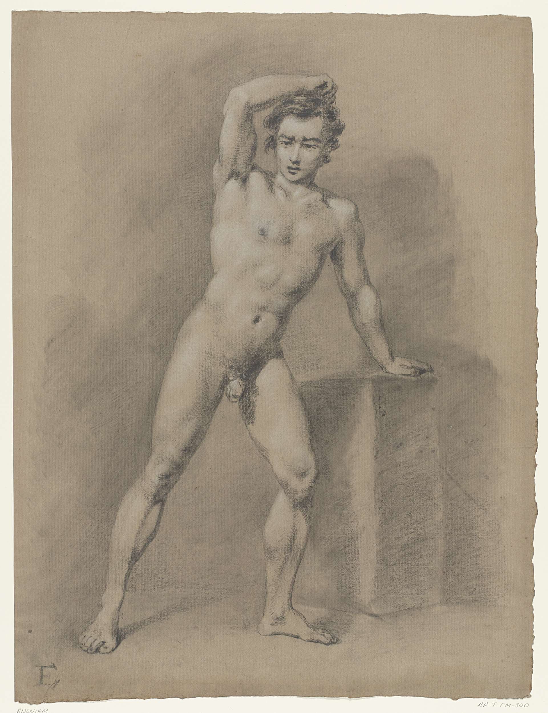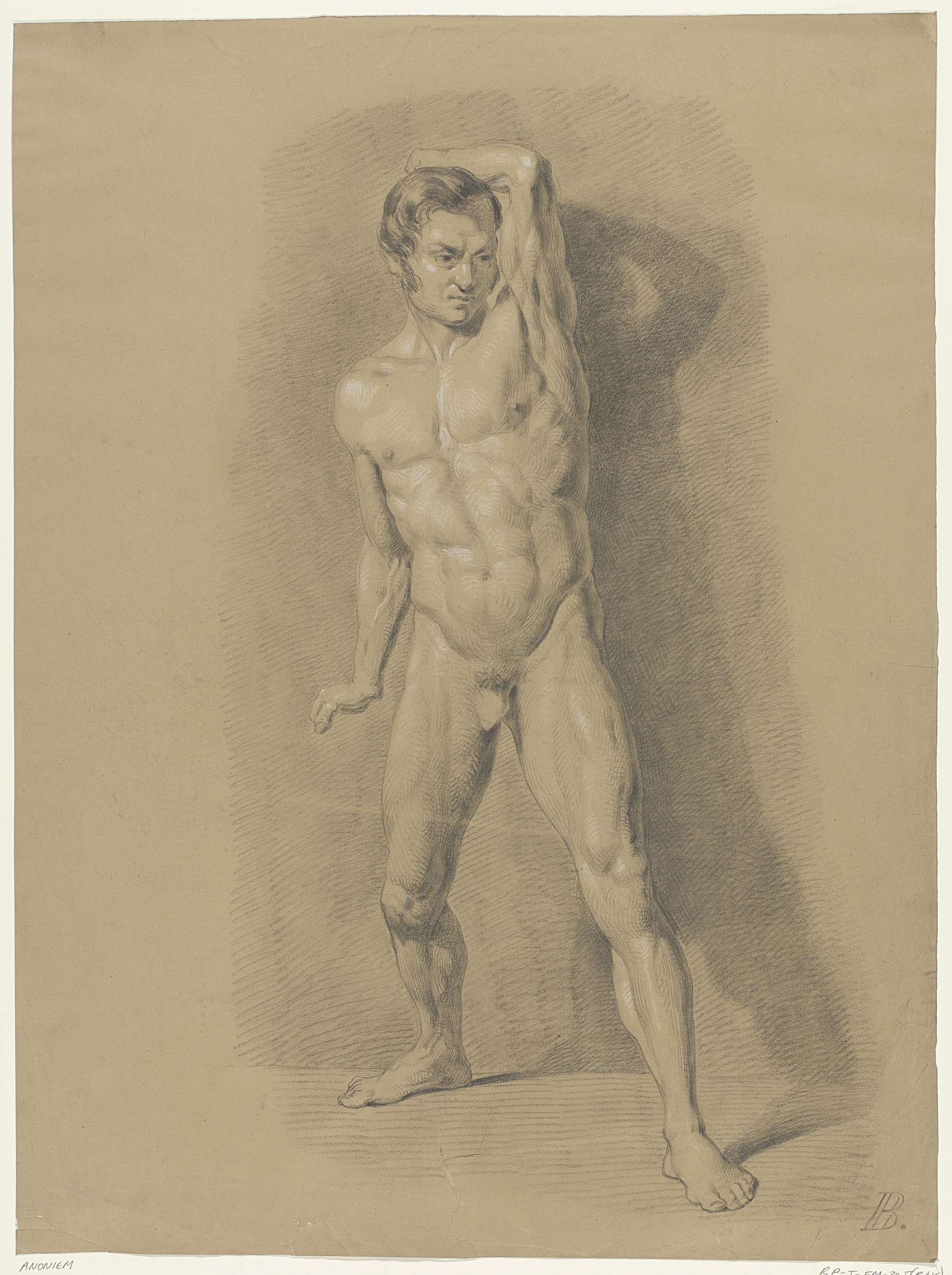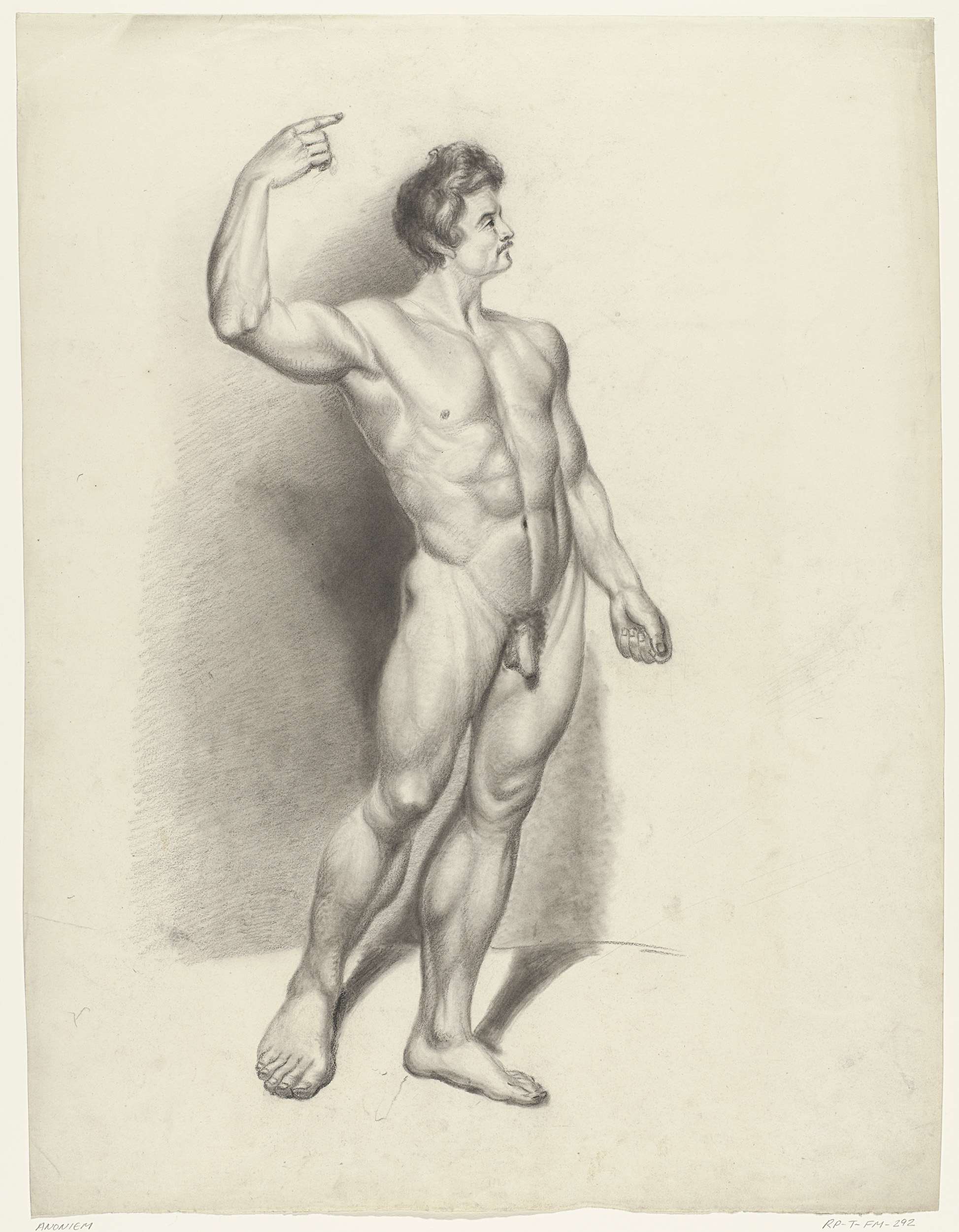 Staand mannelijk naakt met opgeheven arm, naar rechts