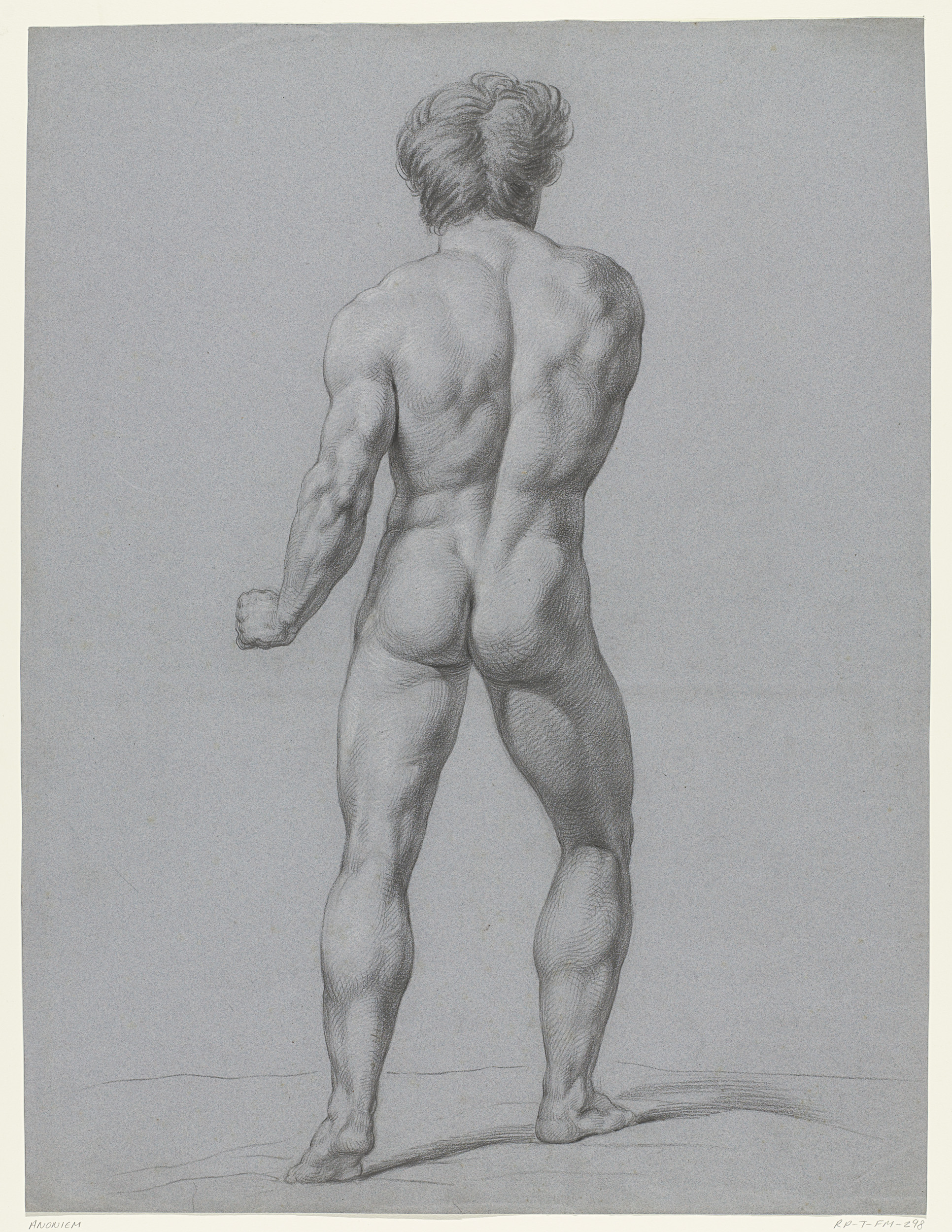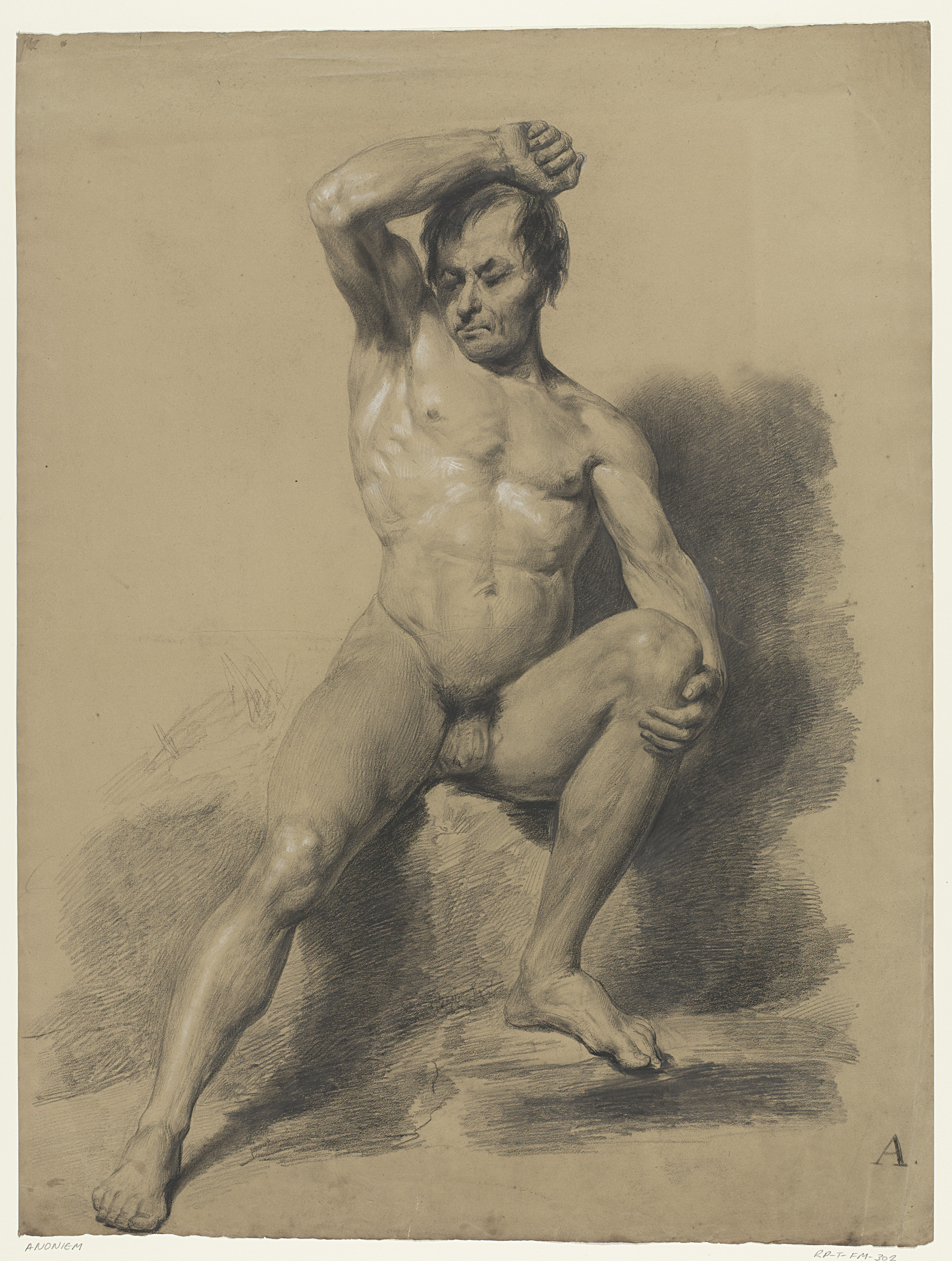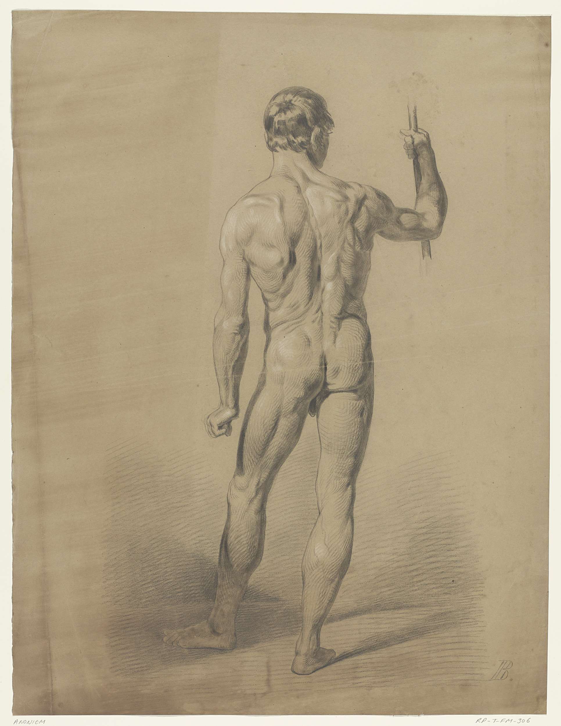 Staand mannelijk naakt met opgeheven arm, naar rechts