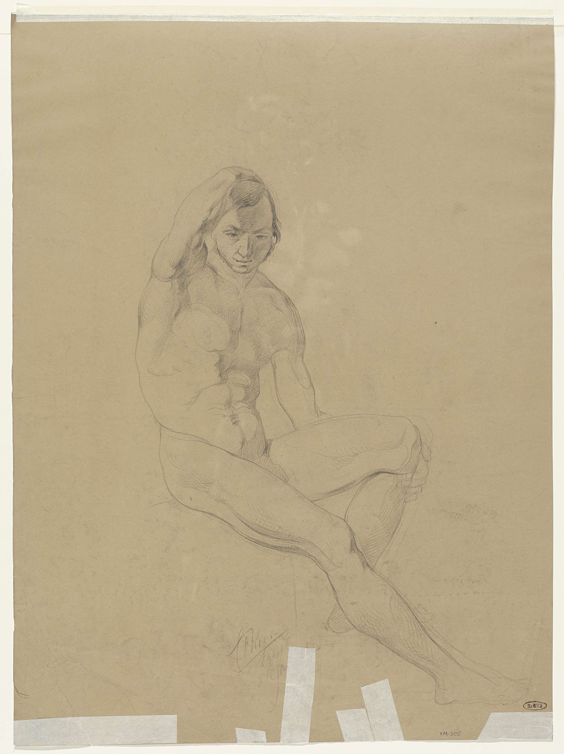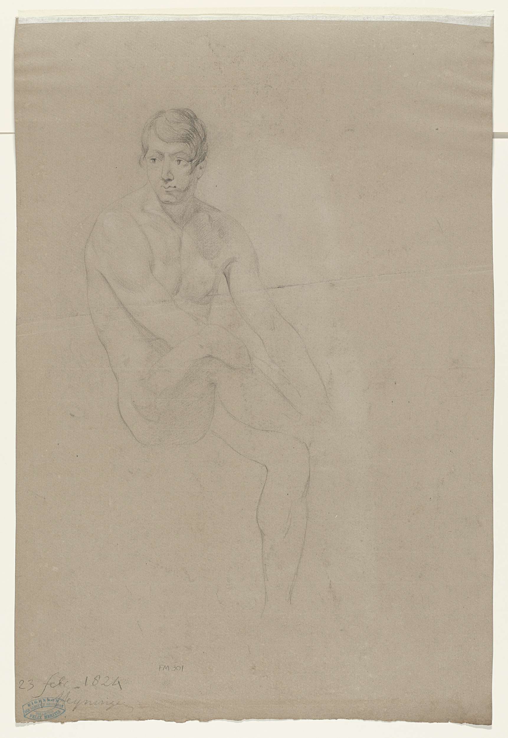 Zittend mannelijk naakt, op een blok, met gestrekt b...